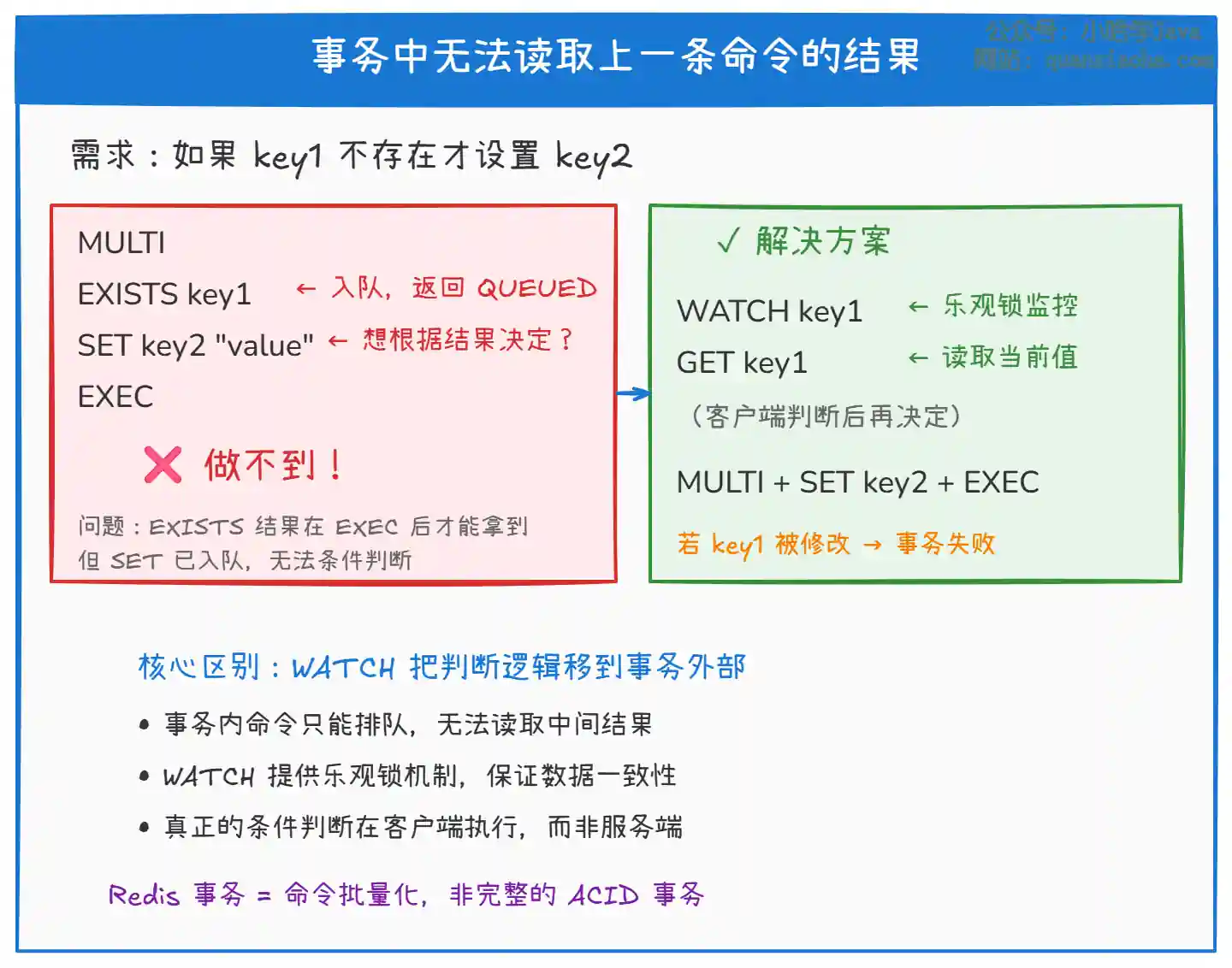 EXEC之前只是入队,不会执行。所以你无法在事务中根据上一条命令的结果来决定下一条命令怎么写。 WATCH可以实现 乐观锁:在事务开启前监控某个 Key,如果这个 Key 在事务执行前被其他客户端修改了,整个事务会自动失败。但这仍然无法实现 "根据条件动态决定执行哪些命令"。