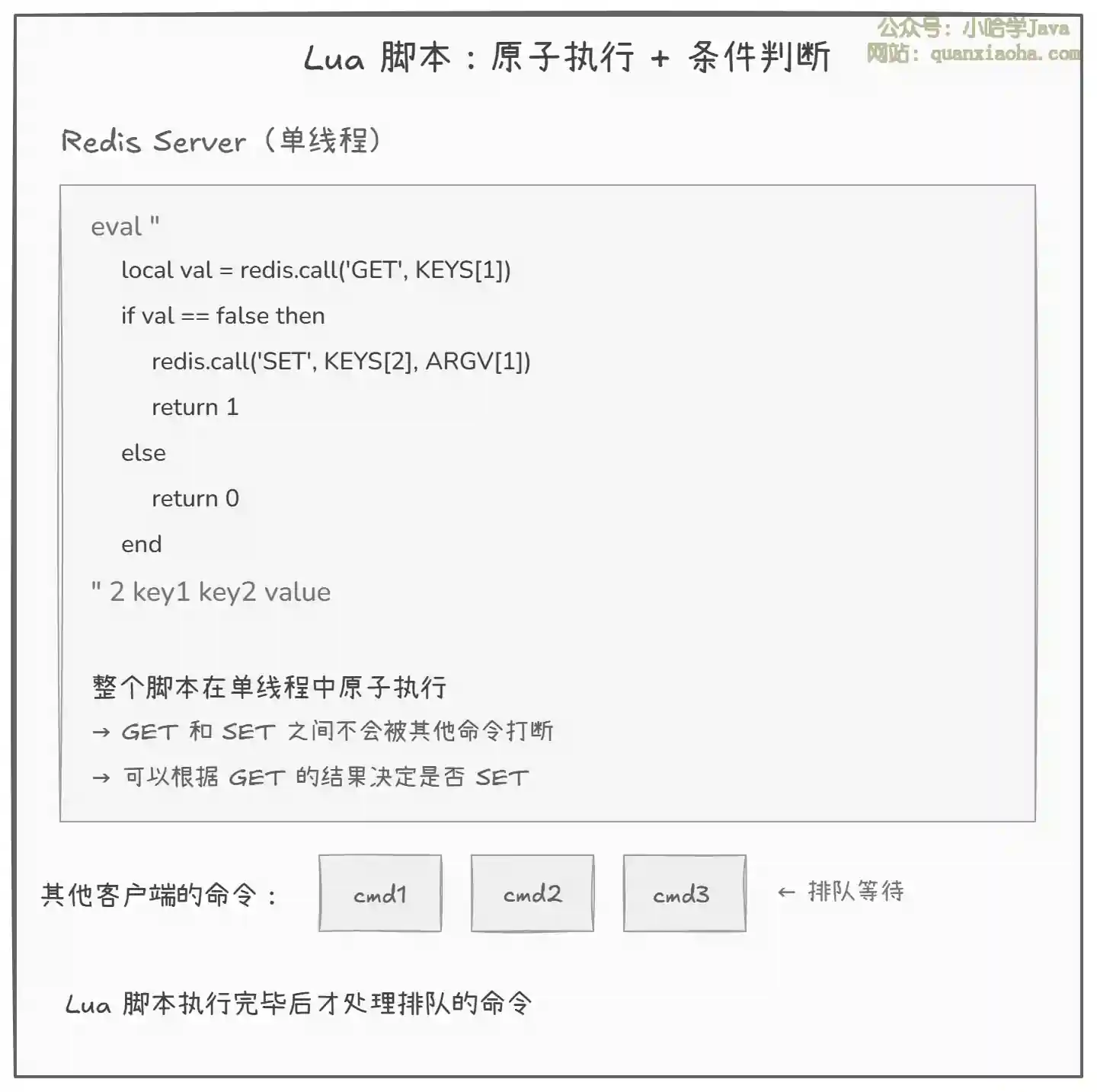 Lua 脚本:原子执行 + 条件判断 + 读中间结果 —— "一个人包场,想看啥看啥,想买啥买啥"。