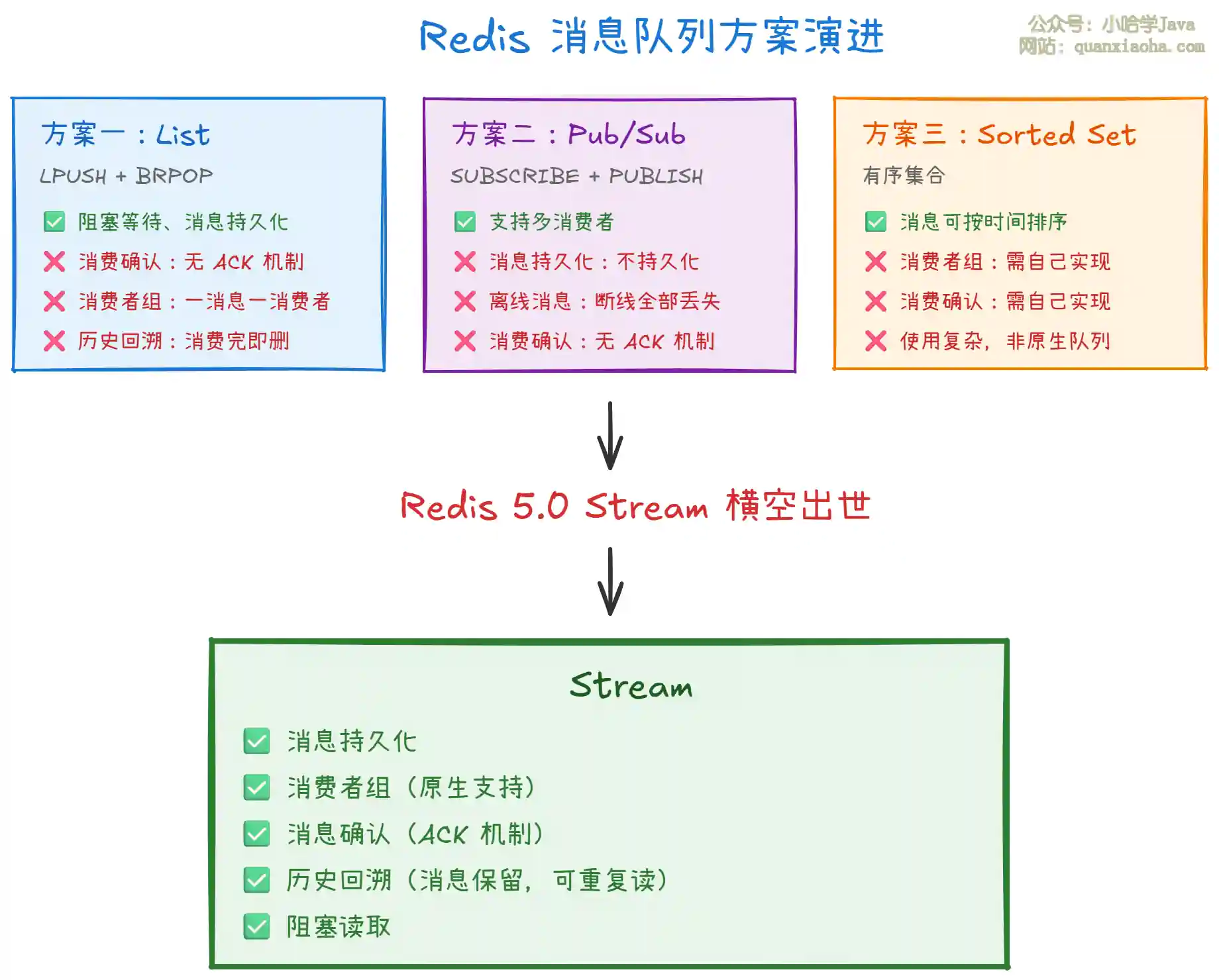 上图展示了 Redis 消息队列方案的演进历程。可以看到,List、Pub/Sub、Sorted Set 各有各的缺陷,Stream 则是 集大成者,一次性解决了所有痛点。