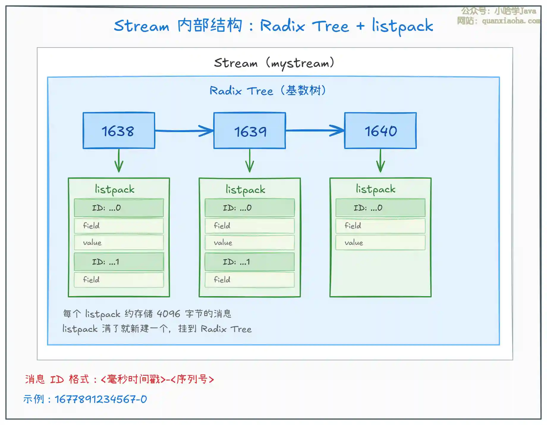 - listpack:一种紧凑的内存编码格式(类似 ziplist 的升级版),每个 listpack 约存储 4096 字节的消息。当一个 listpack 写满了,就创建一个新的,挂到 Radix Tree 的新节点上。