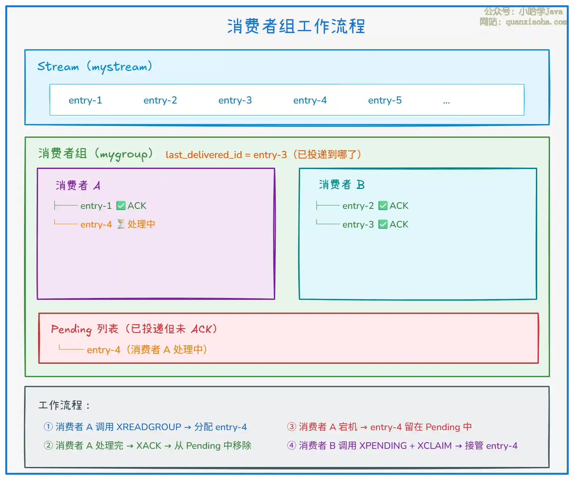 last_delivered_id:消费者组记录了一个游标,表示已经投递到哪条消息了。新消费者加入组后,从这个游标之后开始读取,不会读到旧消息。- 消息分发:同组内的消费者,每条消息只会分配给其中一个(轮询或指定),实现负载均衡。