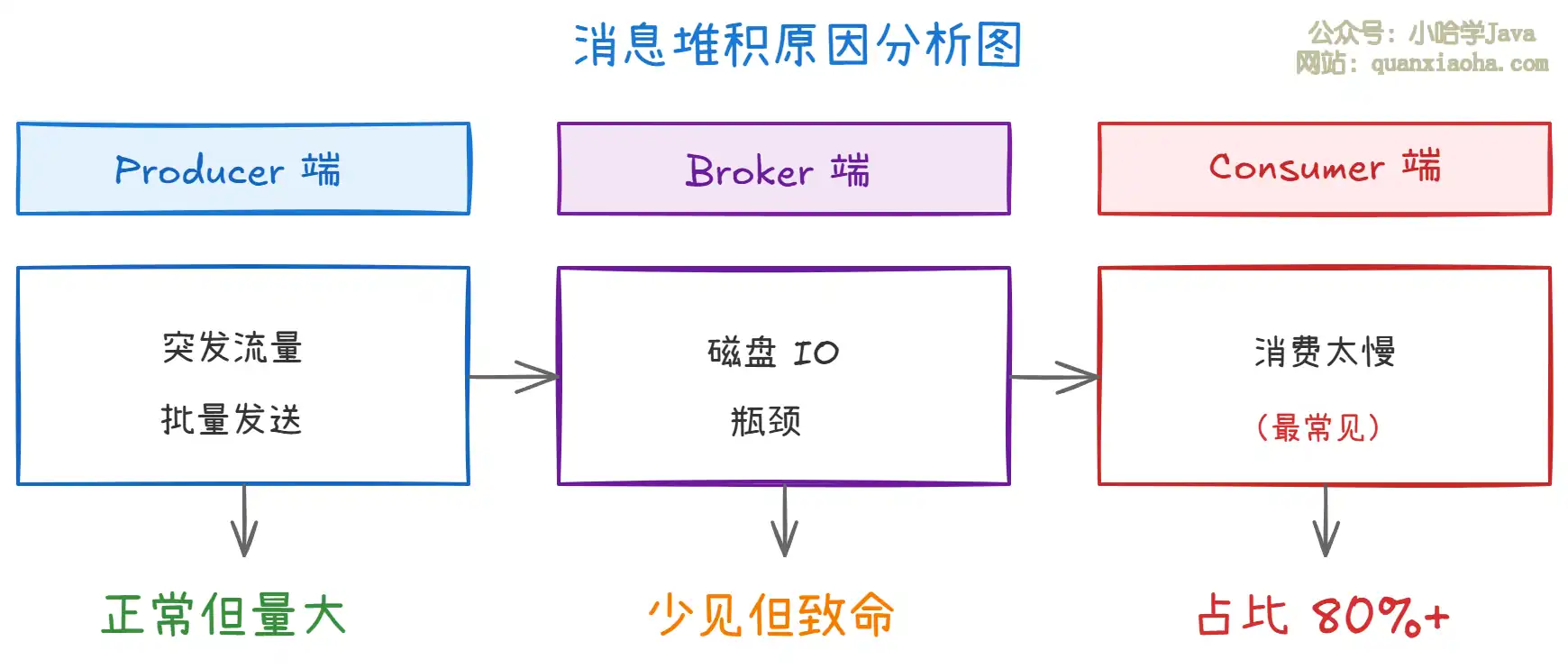 问题诊断能力:面试官不仅仅是想知道你怎么 "救火",更是想知道你是否能快速定位消息堆积的根因——是消费端太慢、还是生产端太猛、还是 Broker 出了问题。