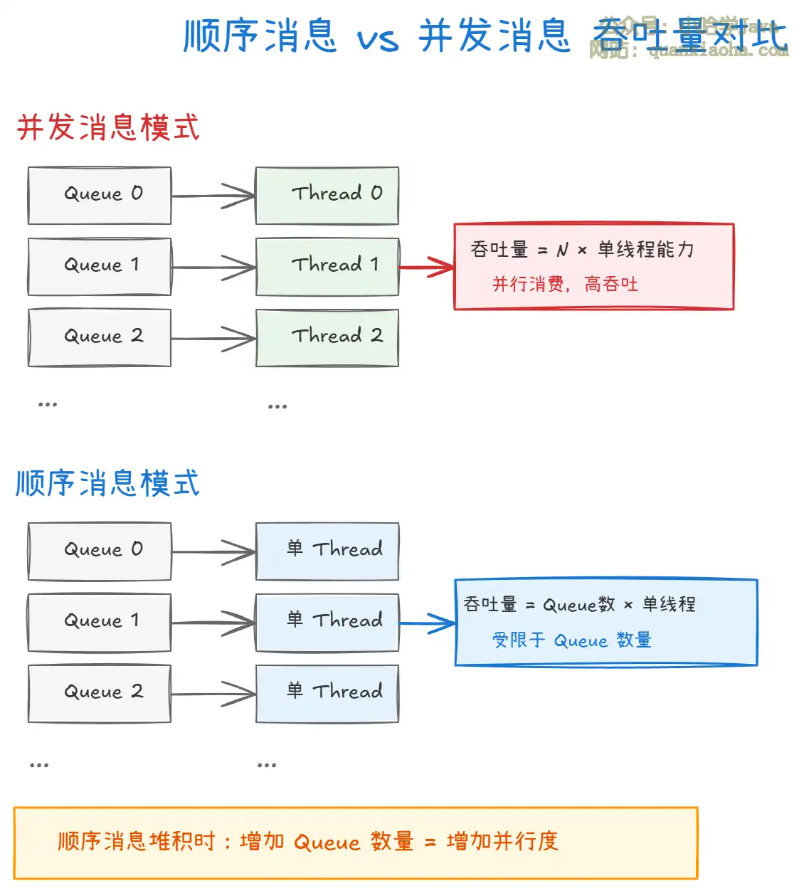 - 如果业务确实需要顺序消费,可以通过 增加 Topic 的 Queue 数量 来提升并行度
