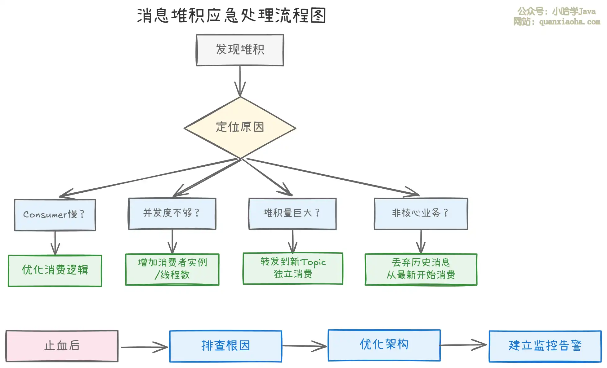 "先止血、再治病"——应急三板斧:扩容(加实例/线程)、转发(新 Topic 缓冲)、丢弃(非核心业务);根治四件套:优化逻辑、调并发、加 Queue、建监控。