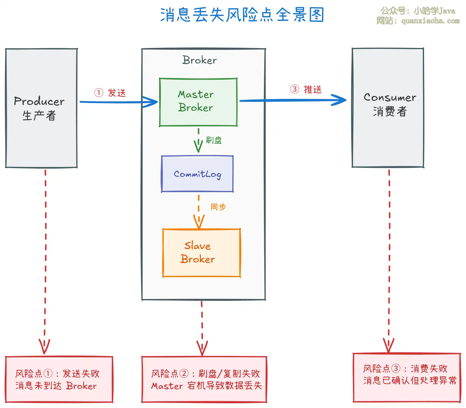 上图展示了消息从生产到消费全链路中可能丢失的三个关键风险点: