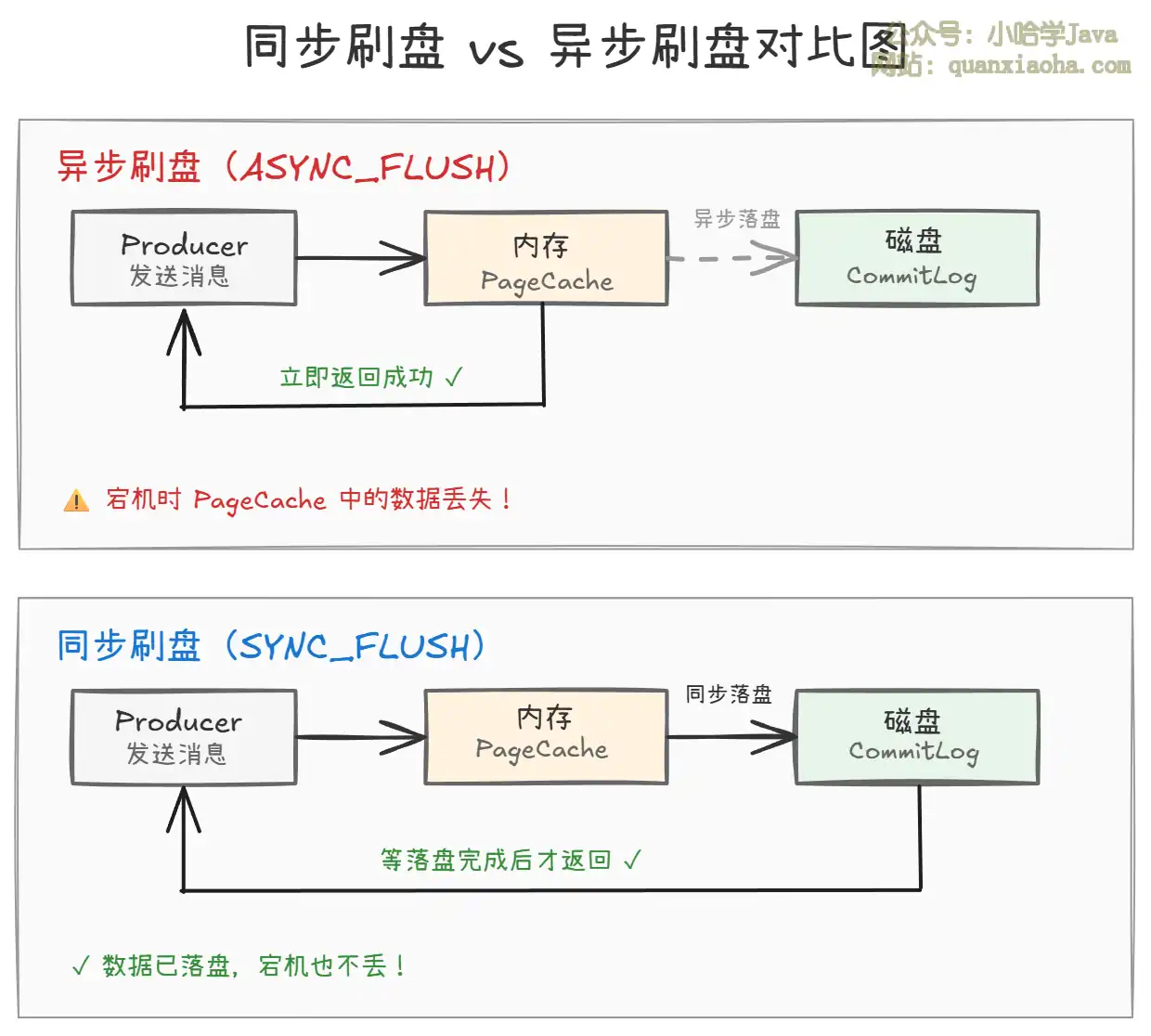 上图对比了两种刷盘策略的工作方式:
