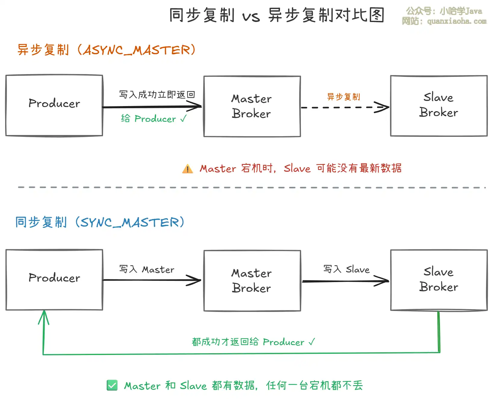 ASYNC_MASTER):Master 写入成功后立即返回给 Producer,异步将数据复制到 Slave。如果 Master 宕机时数据还没复制到 Slave,这部分数据就丢了。 - 同步复制(