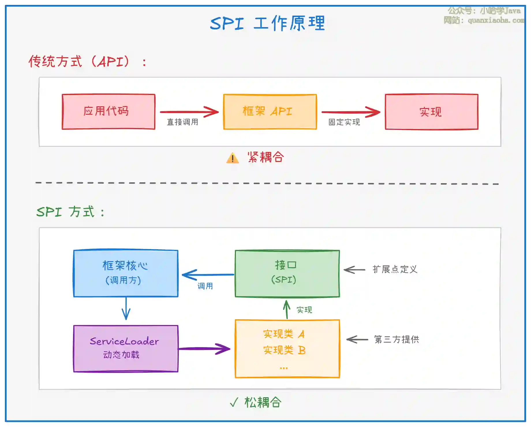 | 发现方式 | 直接调用 | 配置文件 + ServiceLoader 动态加载 |