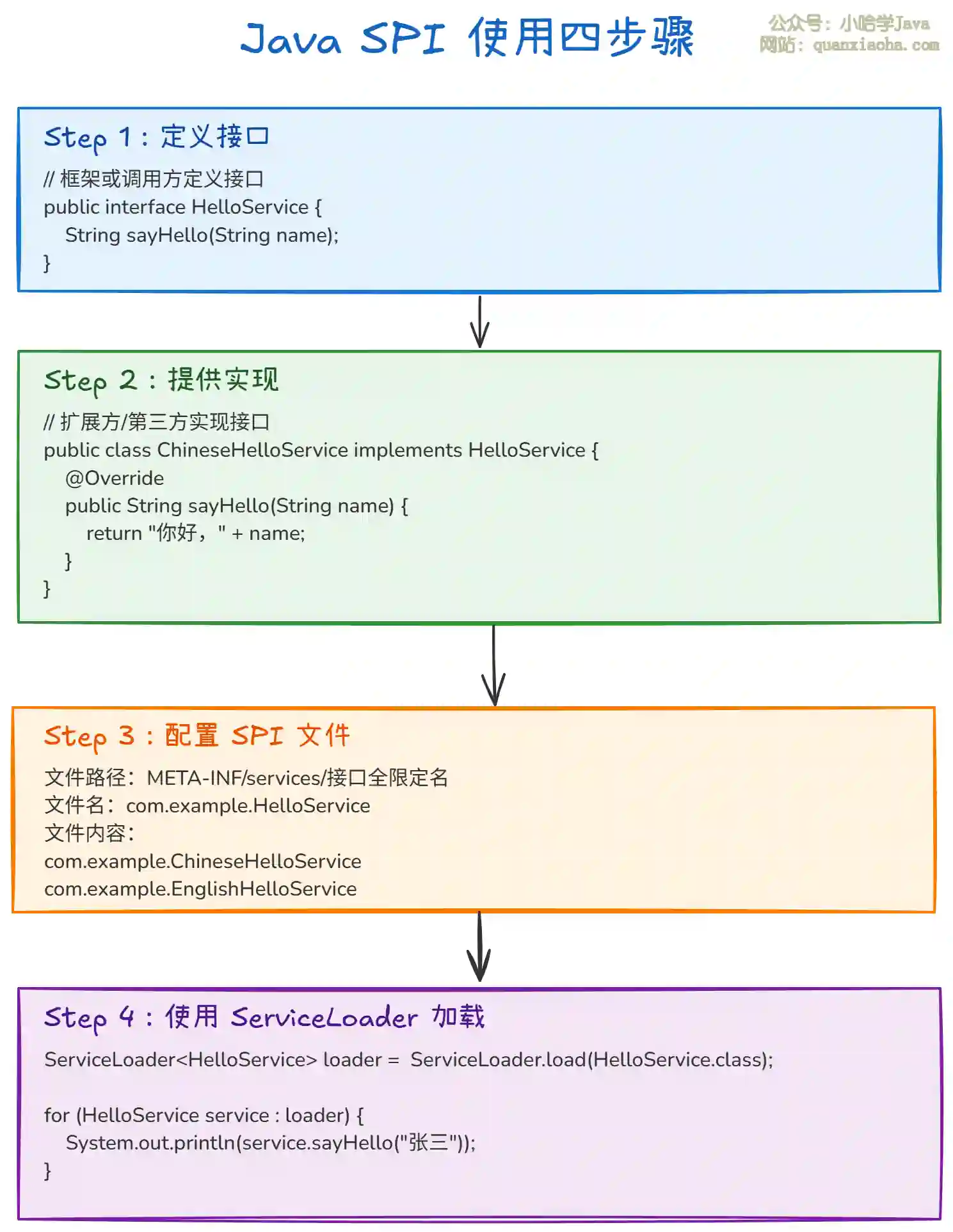 上图展示了 Java SPI 的完整使用流程,下面是详细的代码示例: