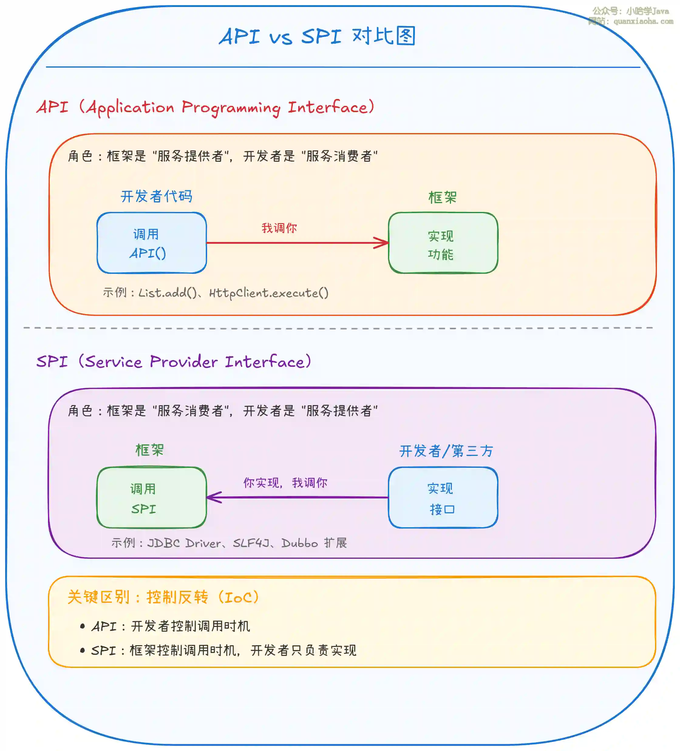 上图从控制流角度对比了 API 和 SPI 的本质区别: