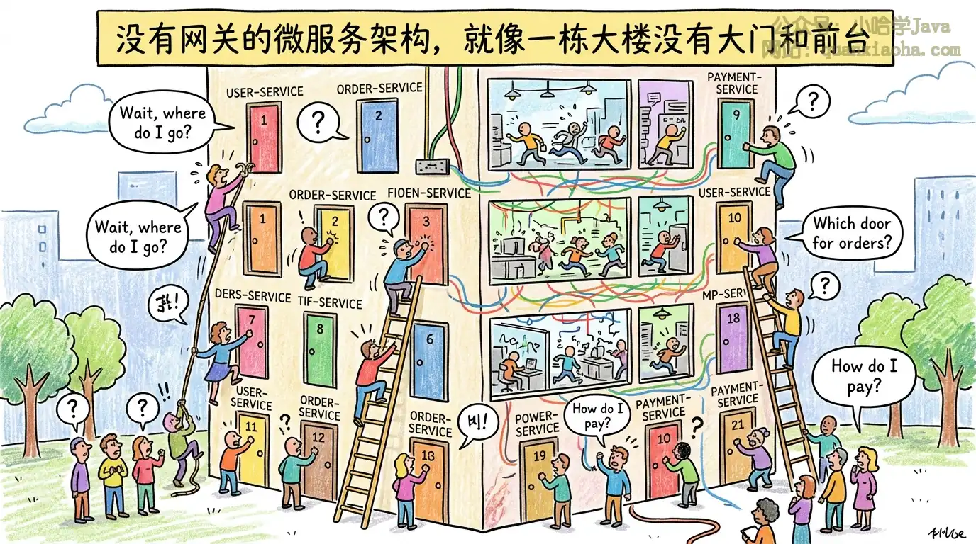 没有网关的微服务架构,就像一栋大楼没有大门和前台——每个来访者都可以直接敲任何一扇门,混乱且危险。