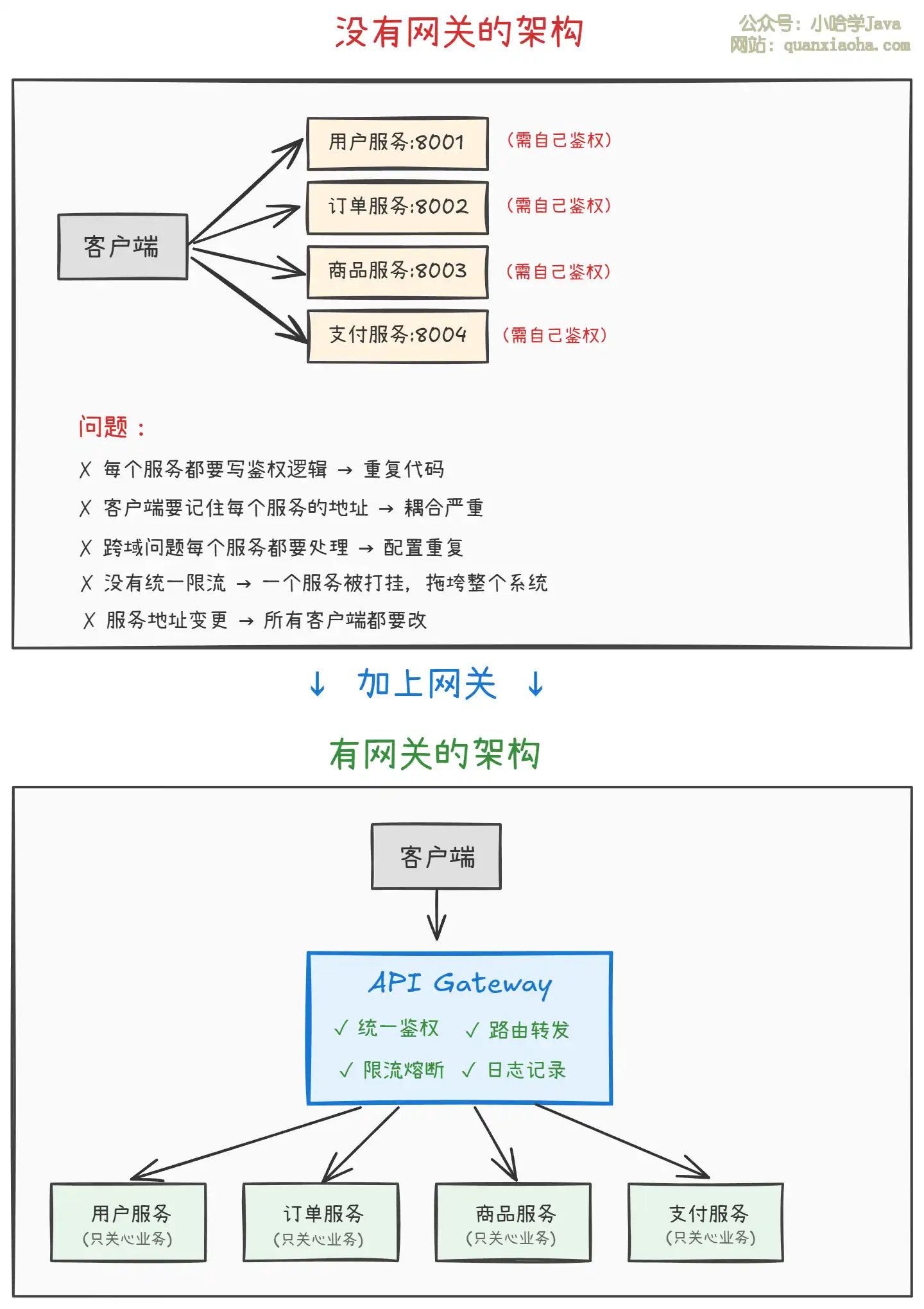 上图对比了有无网关的架构差异。关键区别: