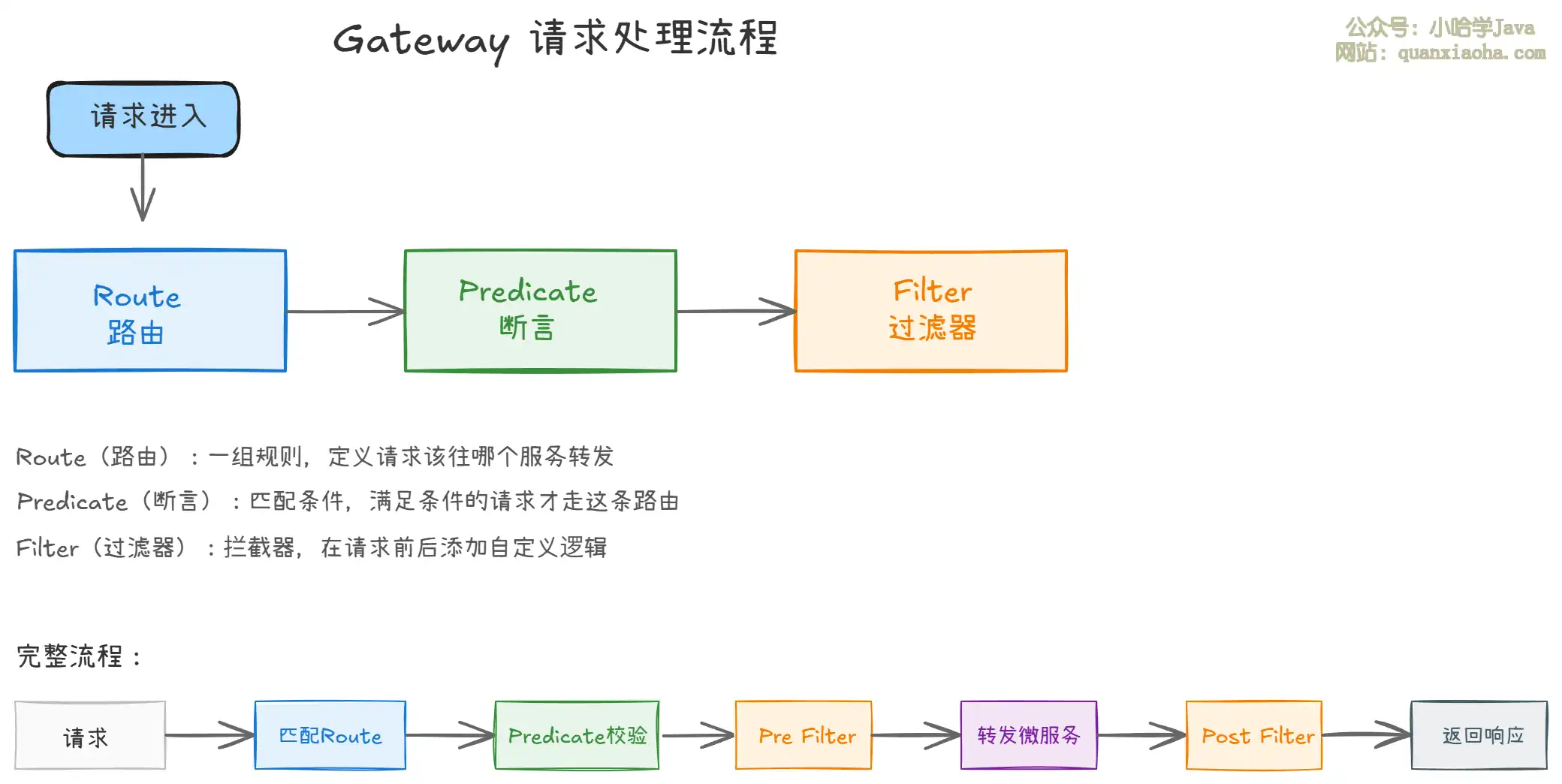 Path=/order/**表示只有/order/开头的请求才会匹配这条路由。支持 Path、Method、Header、Query 等多种匹配方式 - Filter(过滤器):分为 Pre(前置)和 Post(后置)两种,在请求转发前和响应返回后执行自定义逻辑,比如鉴权、加请求头、记录日志等