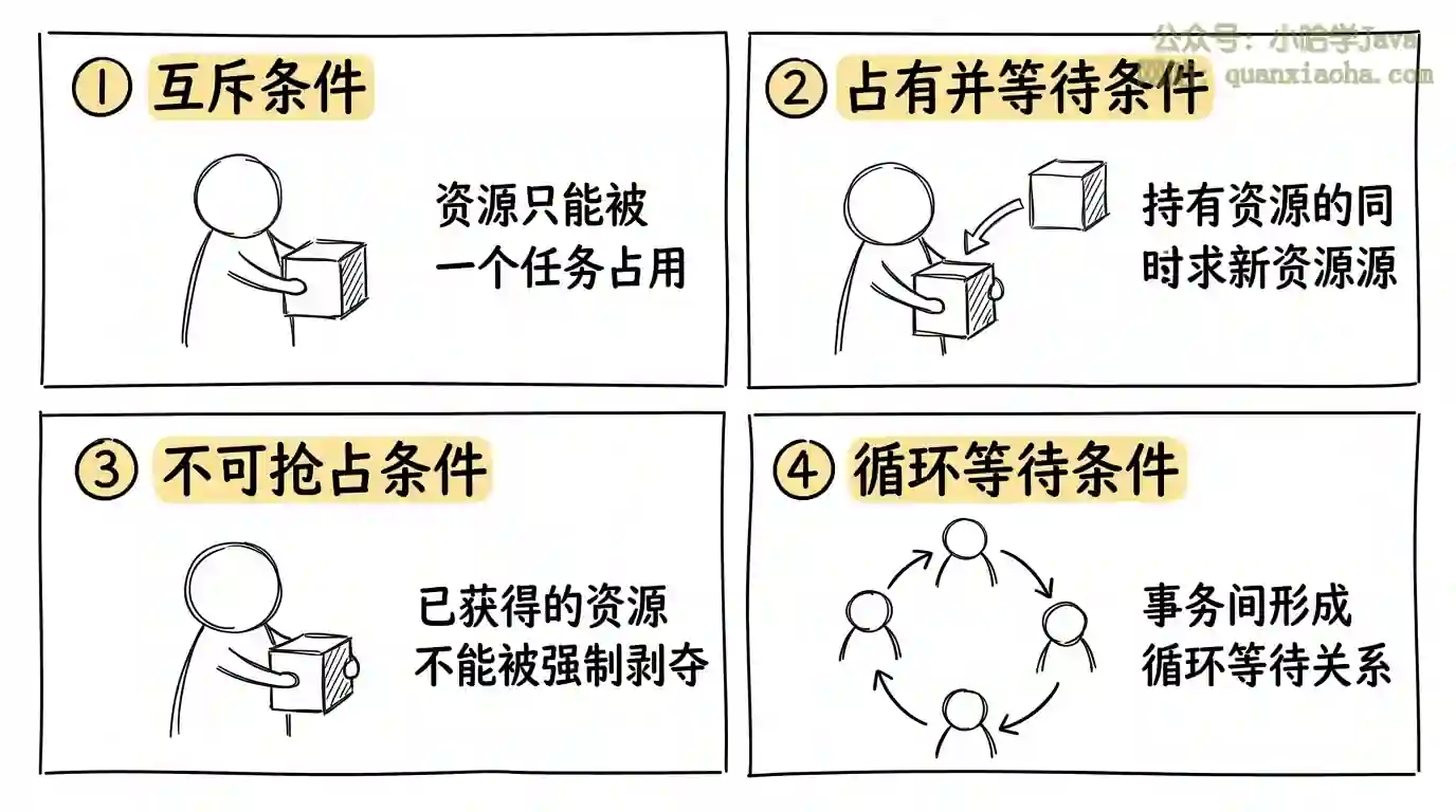 循环等待条件:事务之间形成循环等待关系。可以通过"统一访问顺序"来破坏,这是最实用的方法。