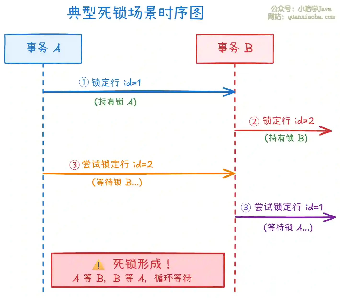 此时形成了循环等待:A 等待 B 释放锁,B 等待 A 释放锁,谁都无法继续,死锁产生。