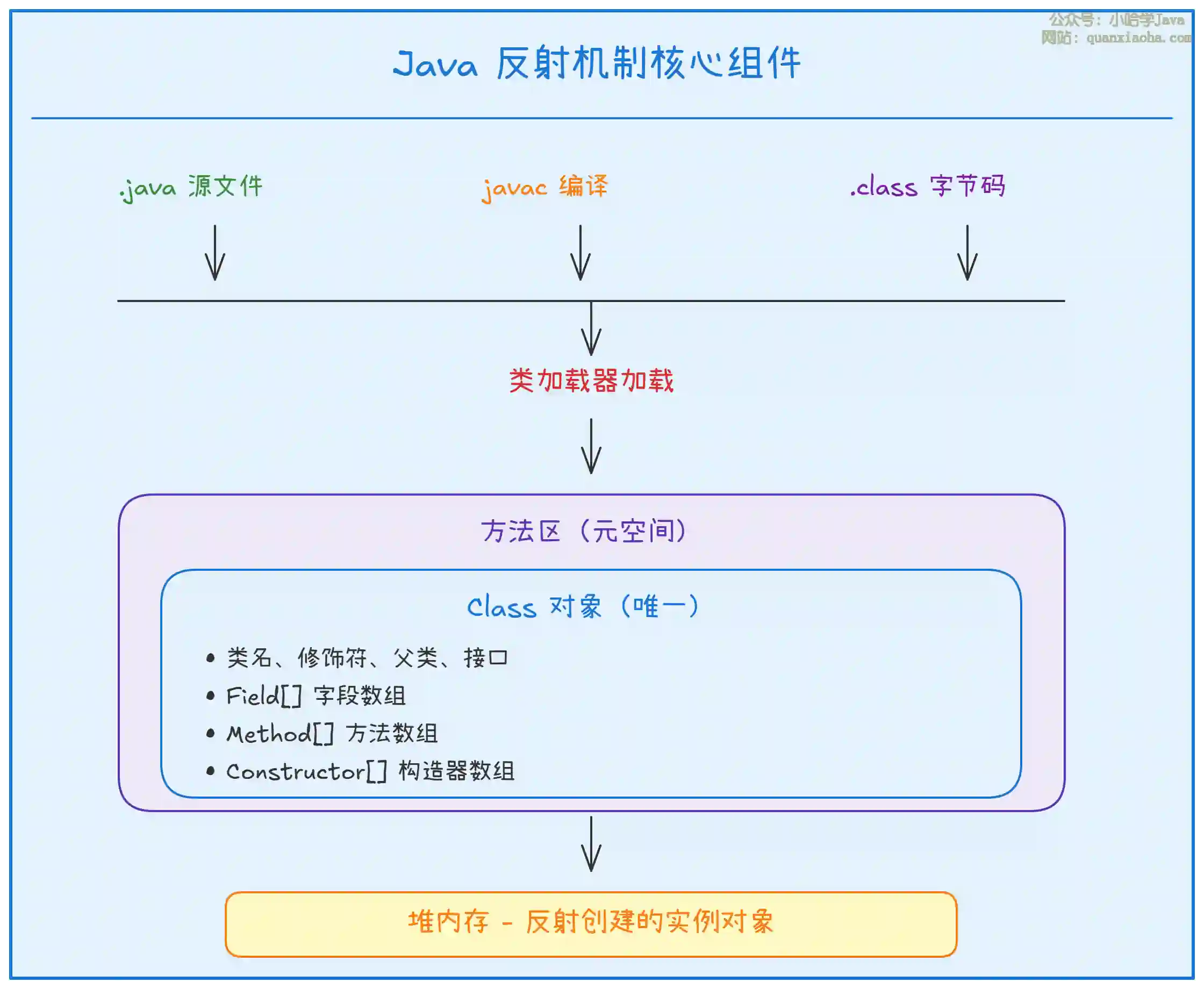 .java源文件被javac编译成.class字节码文件,包含了类的完整元数据信息。 -