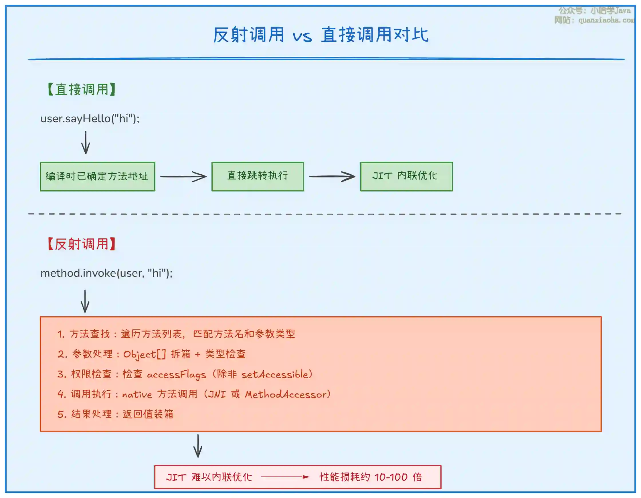 | JIT 优化受限 | 反射调用难以被 JIT 内联优化 |