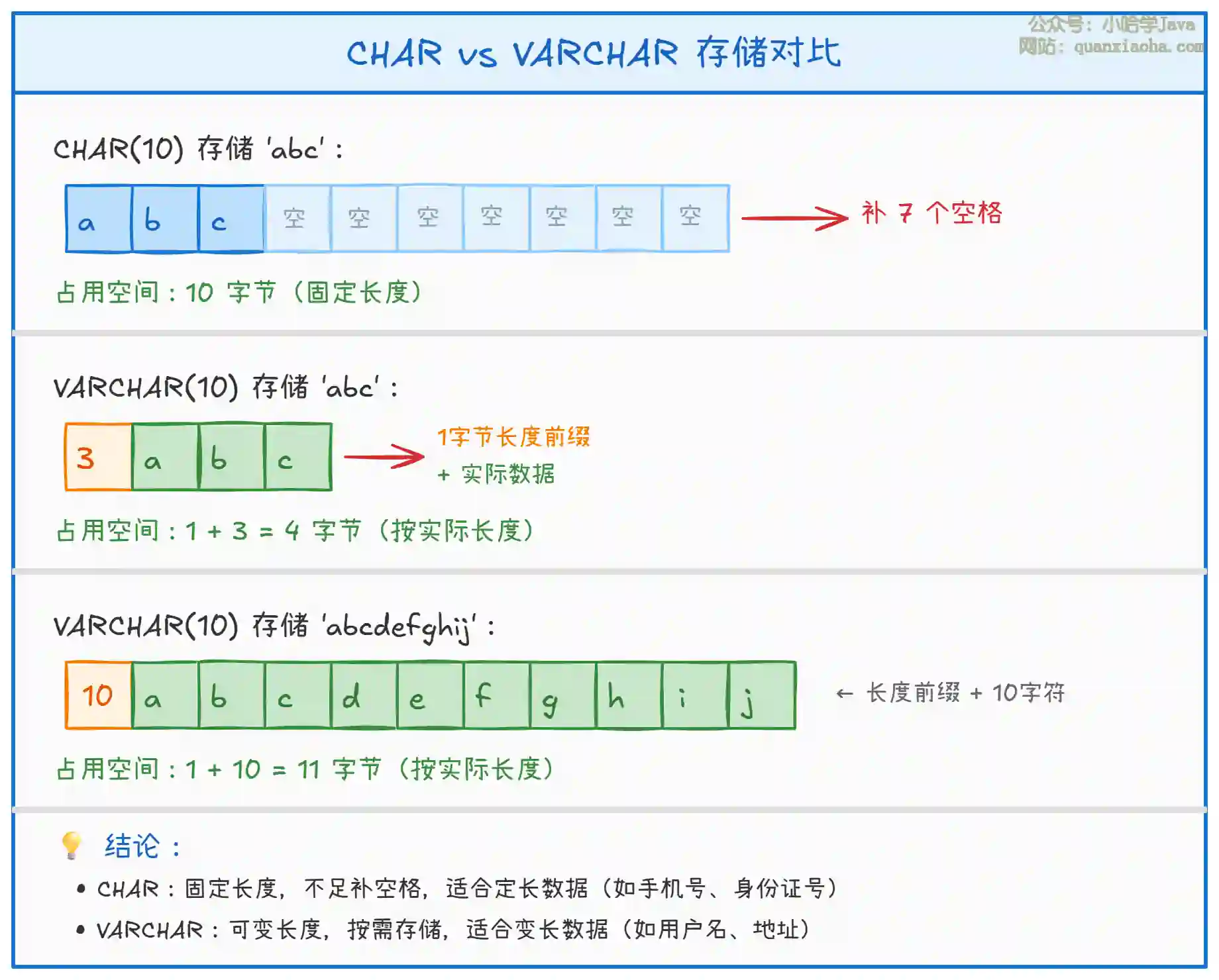 CHAR(10)存储'abc'→ 占用 10 字节VARCHAR(10)存储'abc'→ 占用 4 字节(1 长度 + 3 数据)VARCHAR(1000)存储'abc'→ 占用 5 字节(2 长度 + 3 数据)