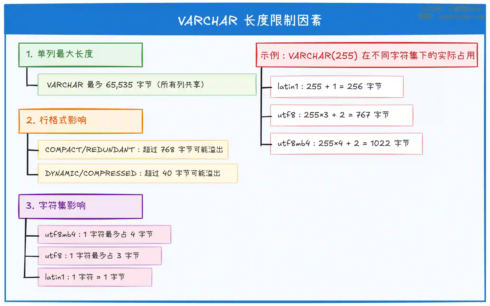 在 InnoDB 存储引擎中,VARCHAR 的最大长度受多个因素限制: