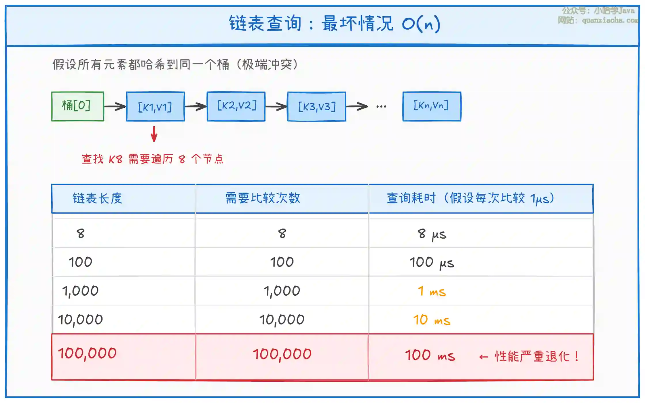 上图展示了链表在极端哈希冲突场景下的性能问题。关键点: