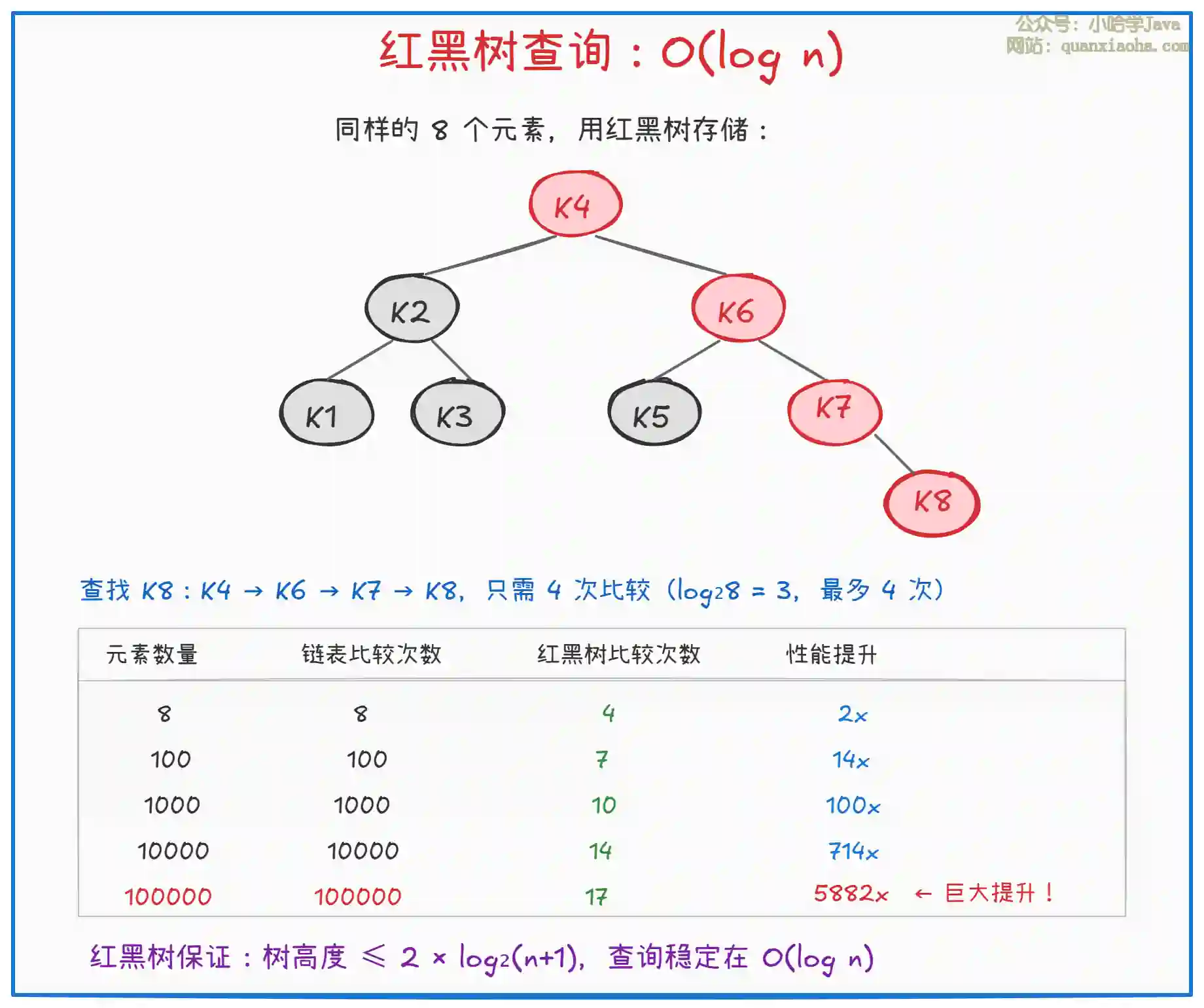 性能优化意识:面试官不仅仅是想知道 "用了红黑树" 这个事实,更是想知道你是否理解链表查询 O(n) 的性能瓶颈,以及红黑树 O(log n) 的优化意义。