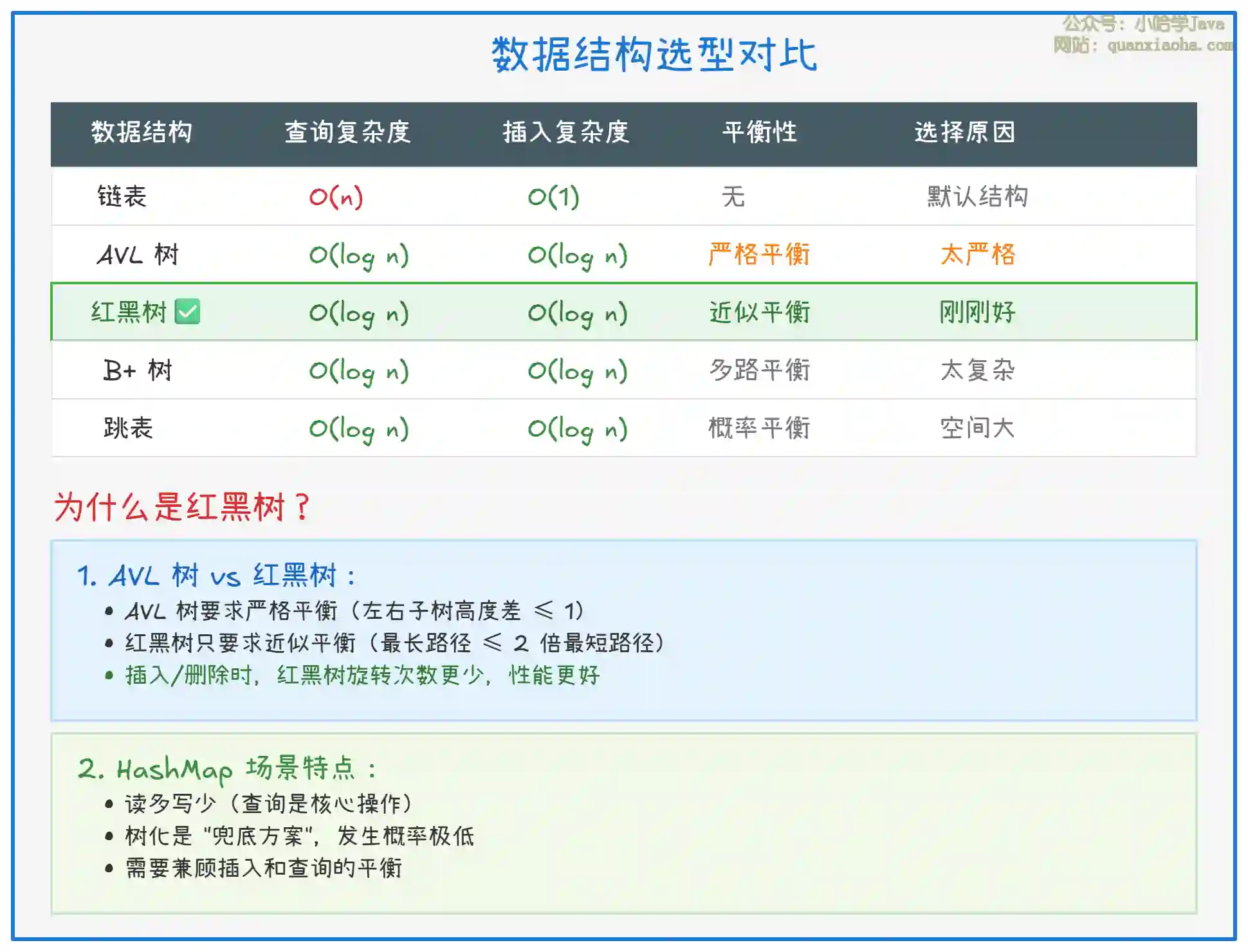 - "红黑树和 AVL 树有什么区别?为什么 HashMap 选红黑树?"
