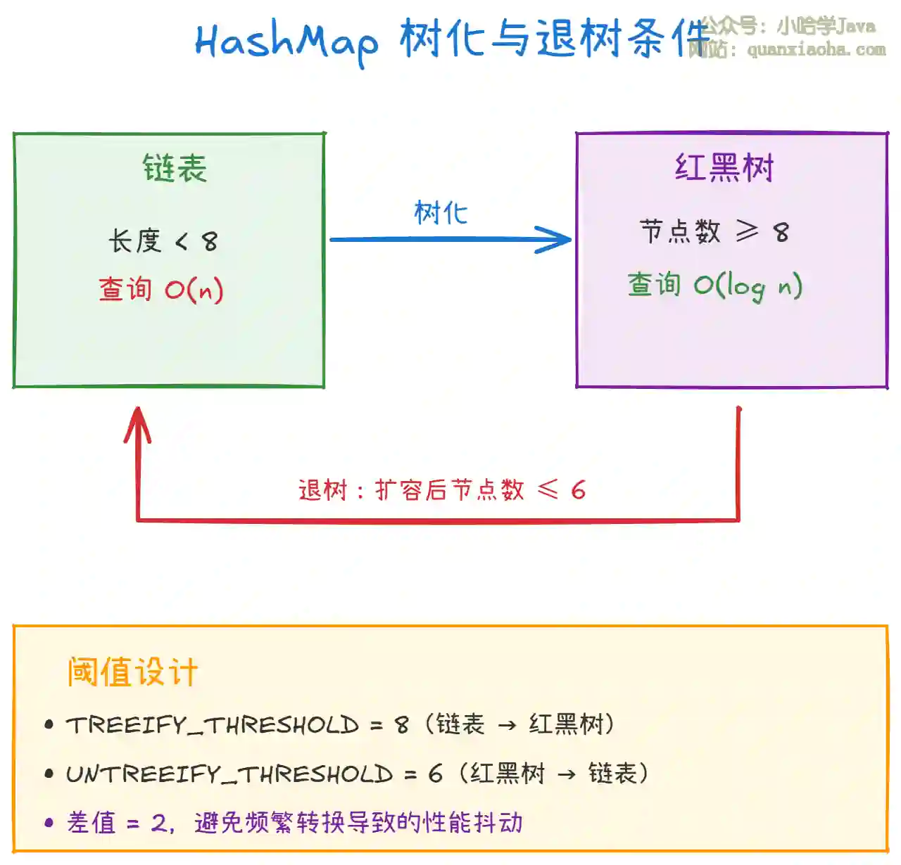 | 链表长度 ≥ 8 | TREEIFY_THRESHOLD | 此时链表查询效率已经明显下降 |