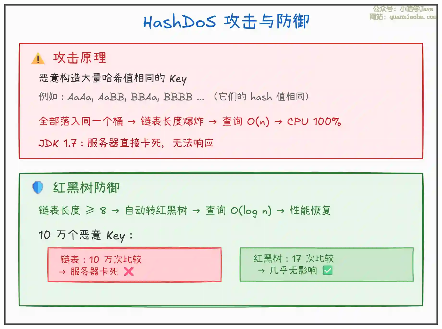 - JDK 1.8 的防御:红黑树将攻击影响从 O(n) 降到 O(log n),攻击成本提高数千倍