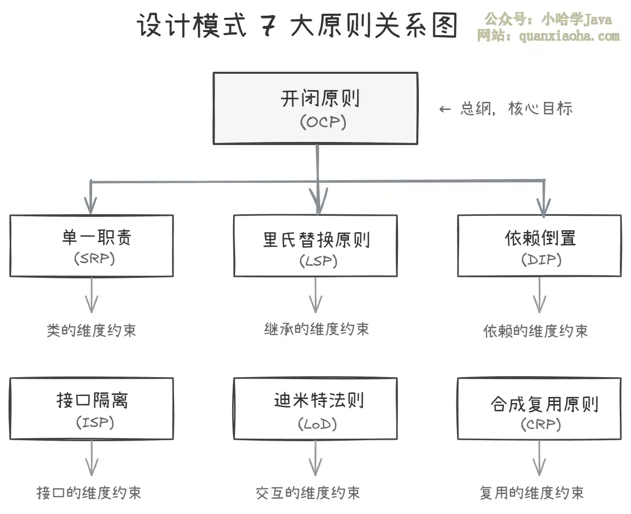 其中前 5 个合称 SOLID 原则(取每个缩写的首字母)。开闭原则 是总纲,其他 6 个原则都是为了实现开闭原则的手段。