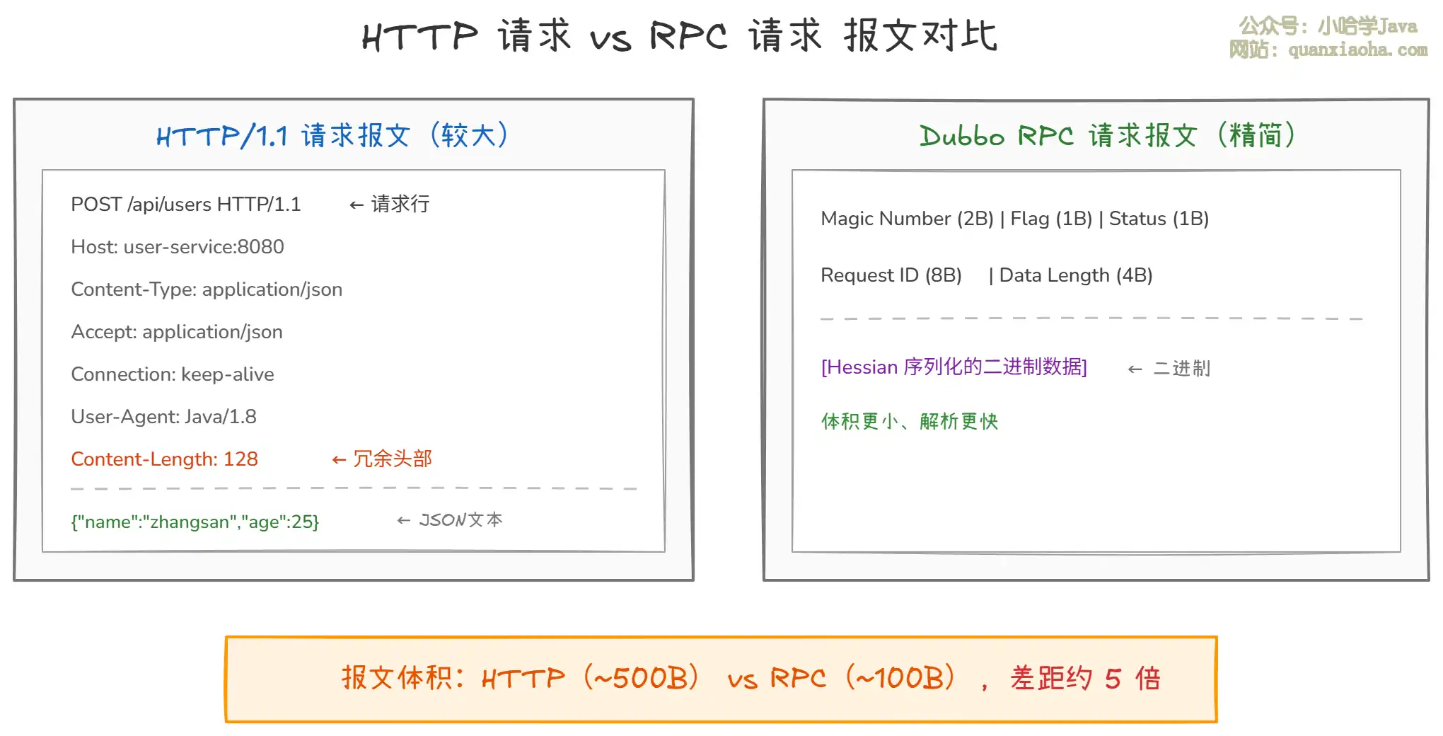 - 协议开销:HTTP/1.1 每次请求都要携带大量头部信息(Host、Content-Type、User-Agent 等),而 RPC 自定义协议只保留必要的魔数、标志位和请求 ID,开销极小。