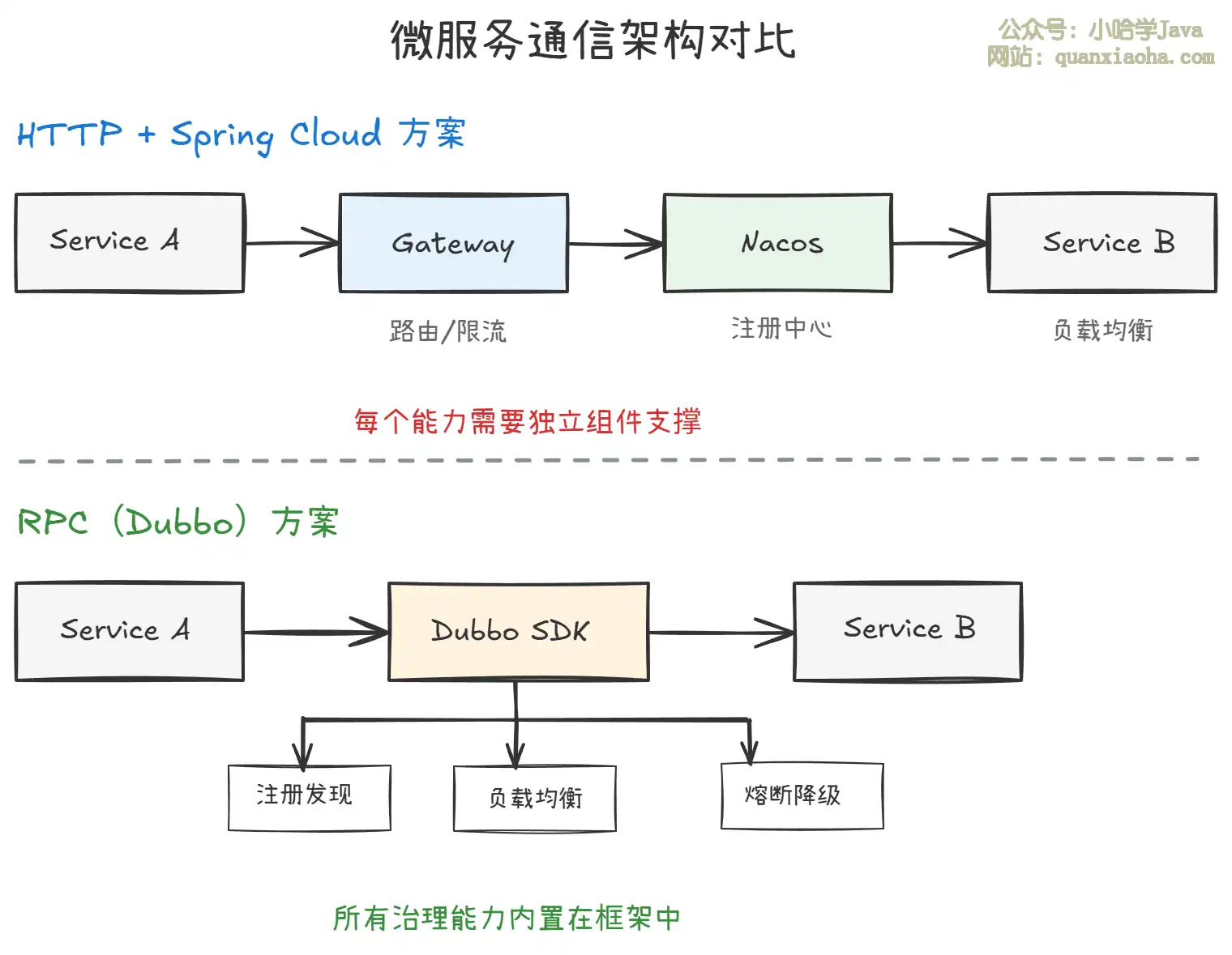 - RPC 方案(如 Dubbo)将这些能力内置在框架中,开箱即用,开发者只需简单配置即可。