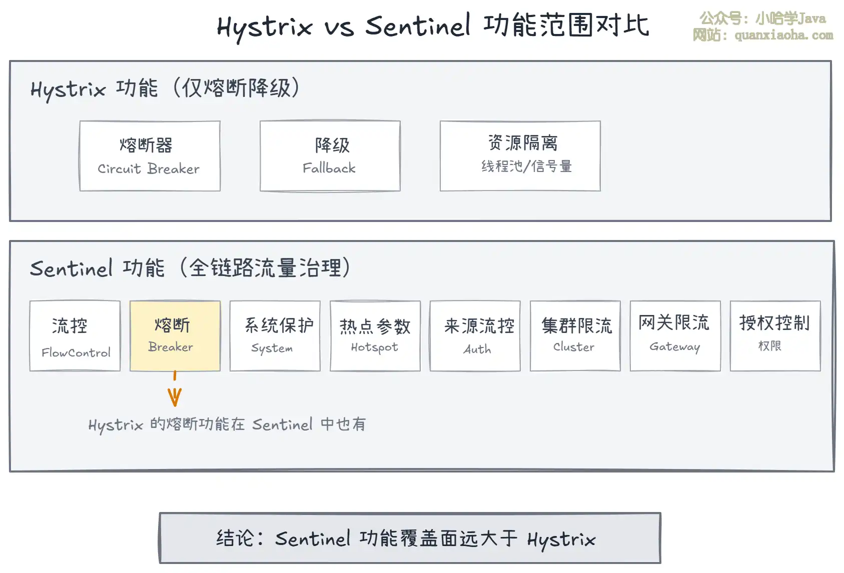 一句话总结:Hystrix 只是一个熔断器,而 Sentinel 是 "熔断 + 限流 + 系统保护 + 热点防护" 的全链路流量治理方案,功能上完全碾压 Hystrix。