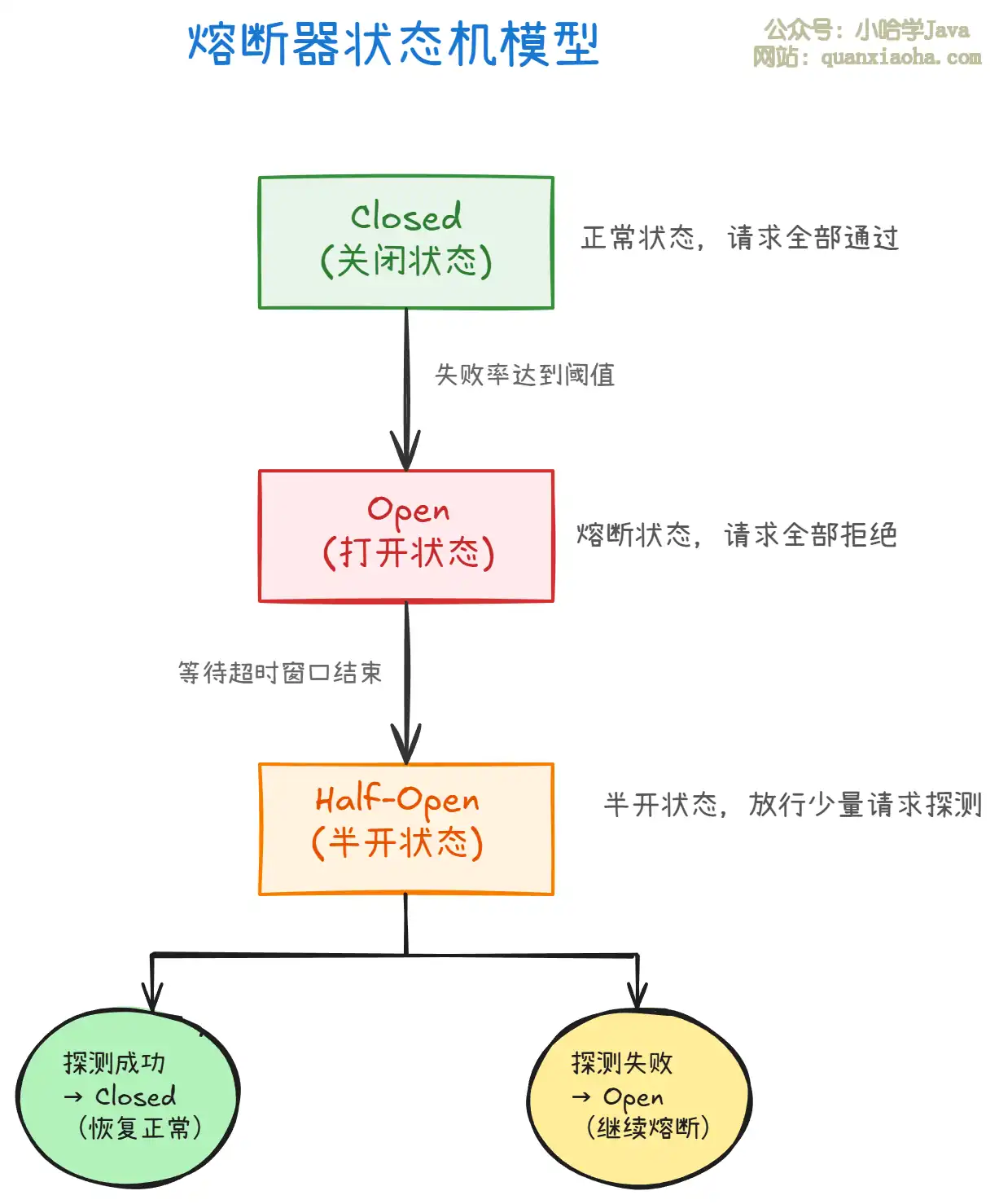 熔断降级原理:面试官不仅仅是想知道两者的功能对比,更是想考察你是否理解熔断器的状态机(Closed → Open → Half-Open)、滑动窗口、降级策略等核心概念。