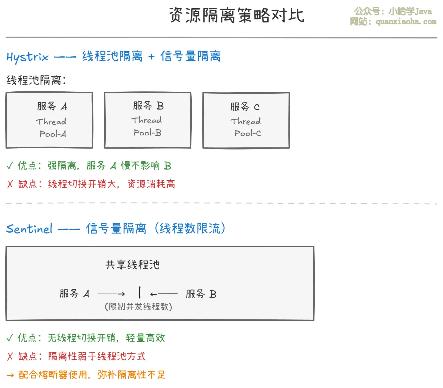 Sentinel 使用 信号量隔离(限制并发线程数)——通过计数器控制同时访问某个资源的线程数,不创建额外线程。优点是轻量高效,没有线程切换开销。配合熔断器一起使用,同样可以达到保护系统的效果。