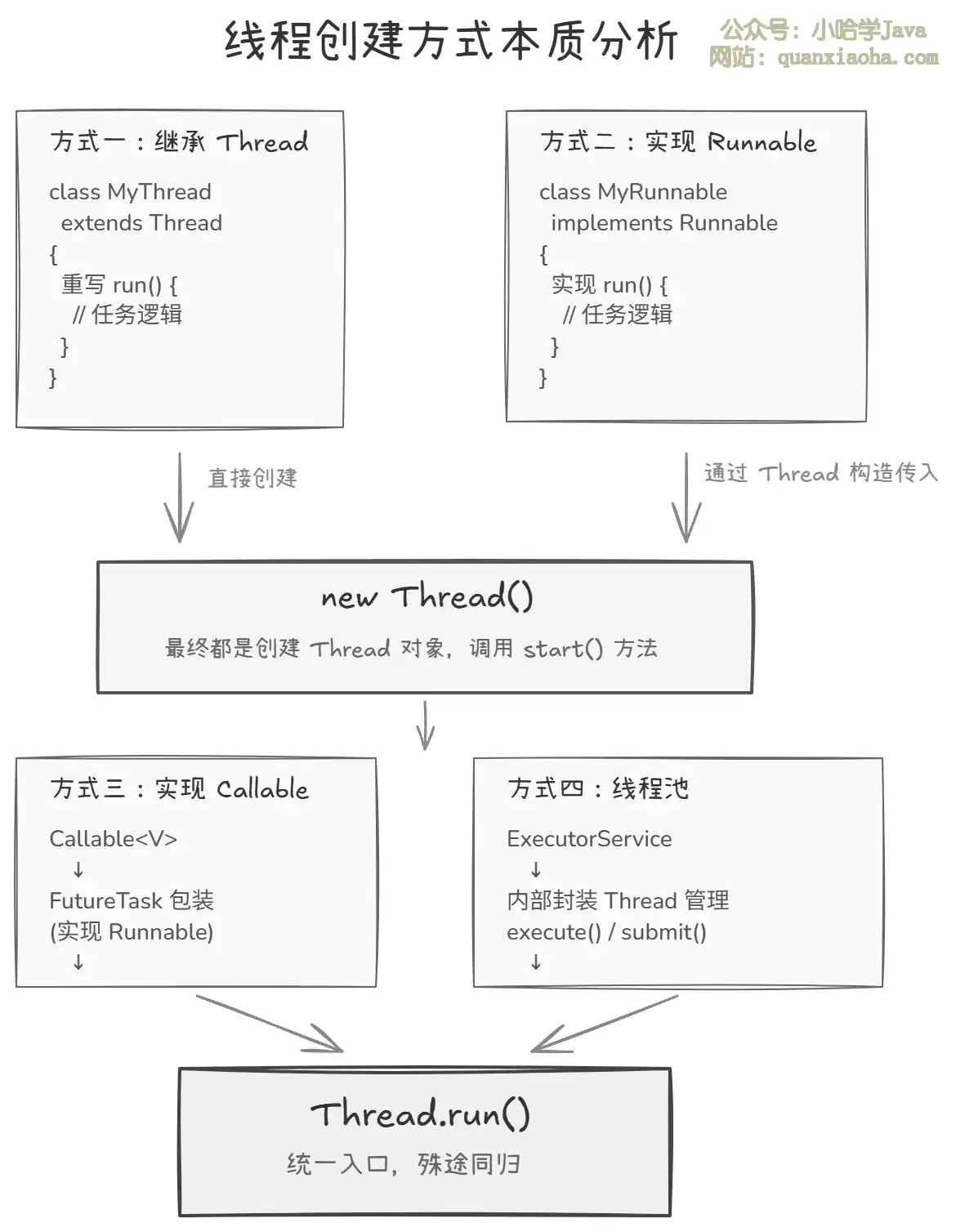 new Thread()创建线程对象,调用start()方法启动线程。区别只在于任务(Runnable/Callable)的定义和传递方式不同。 -