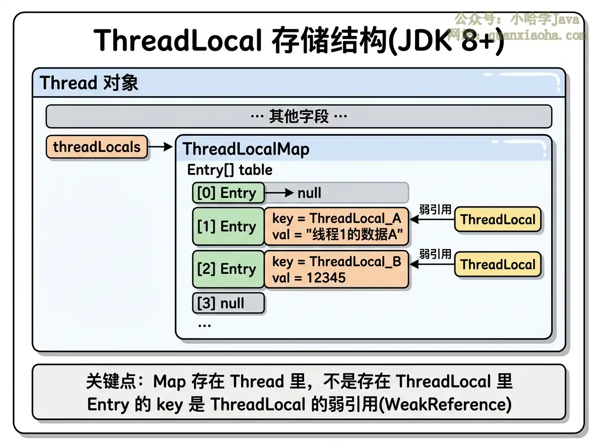 Thread对象持有一个ThreadLocalMap,ThreadLocal只是作为 key 去这个 Map 里存取数据。这样设计的好处是,每个线程只操作自己的 Map,天然线程安全,不需要任何同步措施。 -