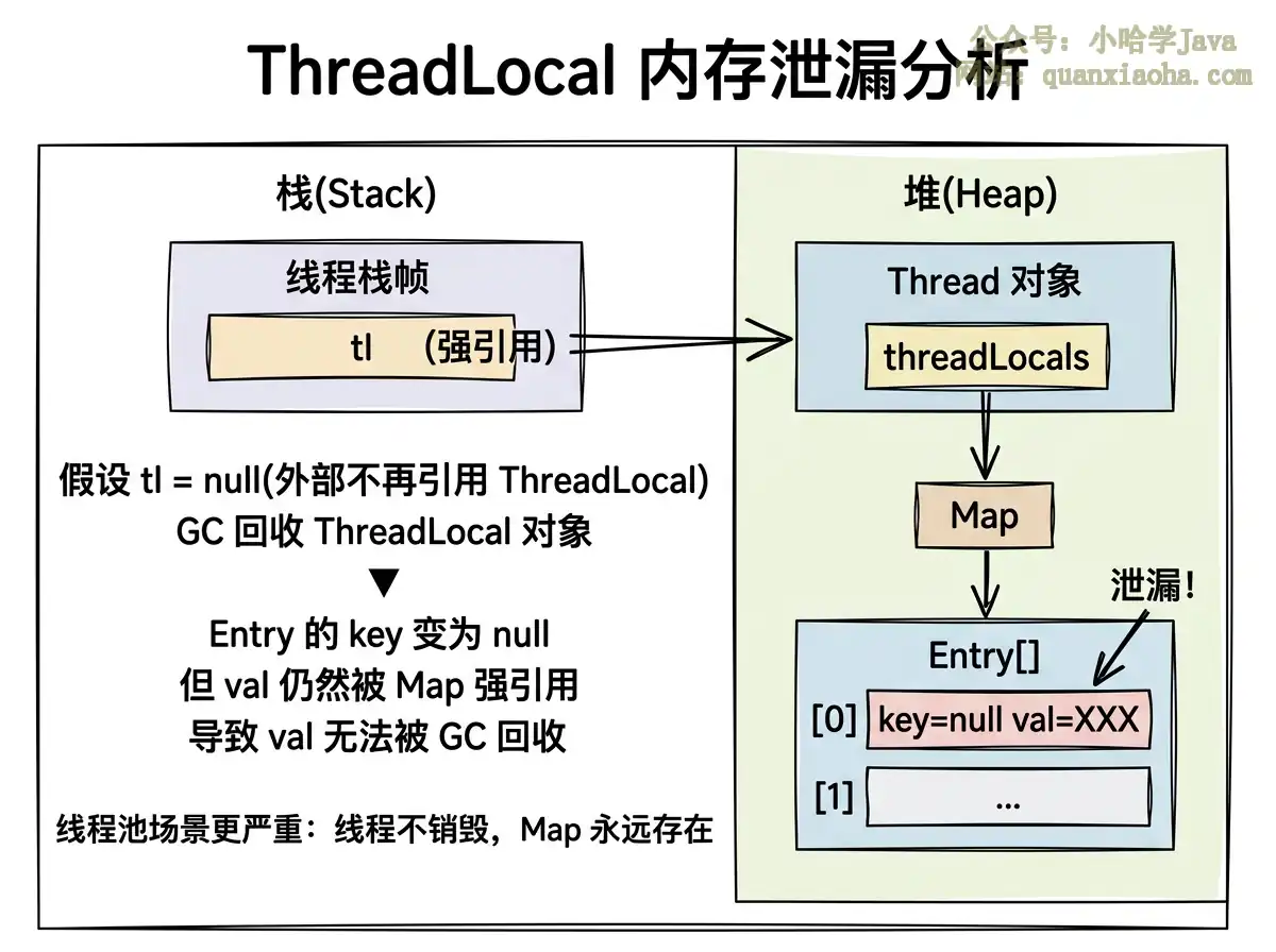 ThreadLocalMap还存在于Thread对象中。只要线程不死,这个key=null的 Entry 就一直占着内存,无法被 GC 回收。这就是内存泄漏。 -