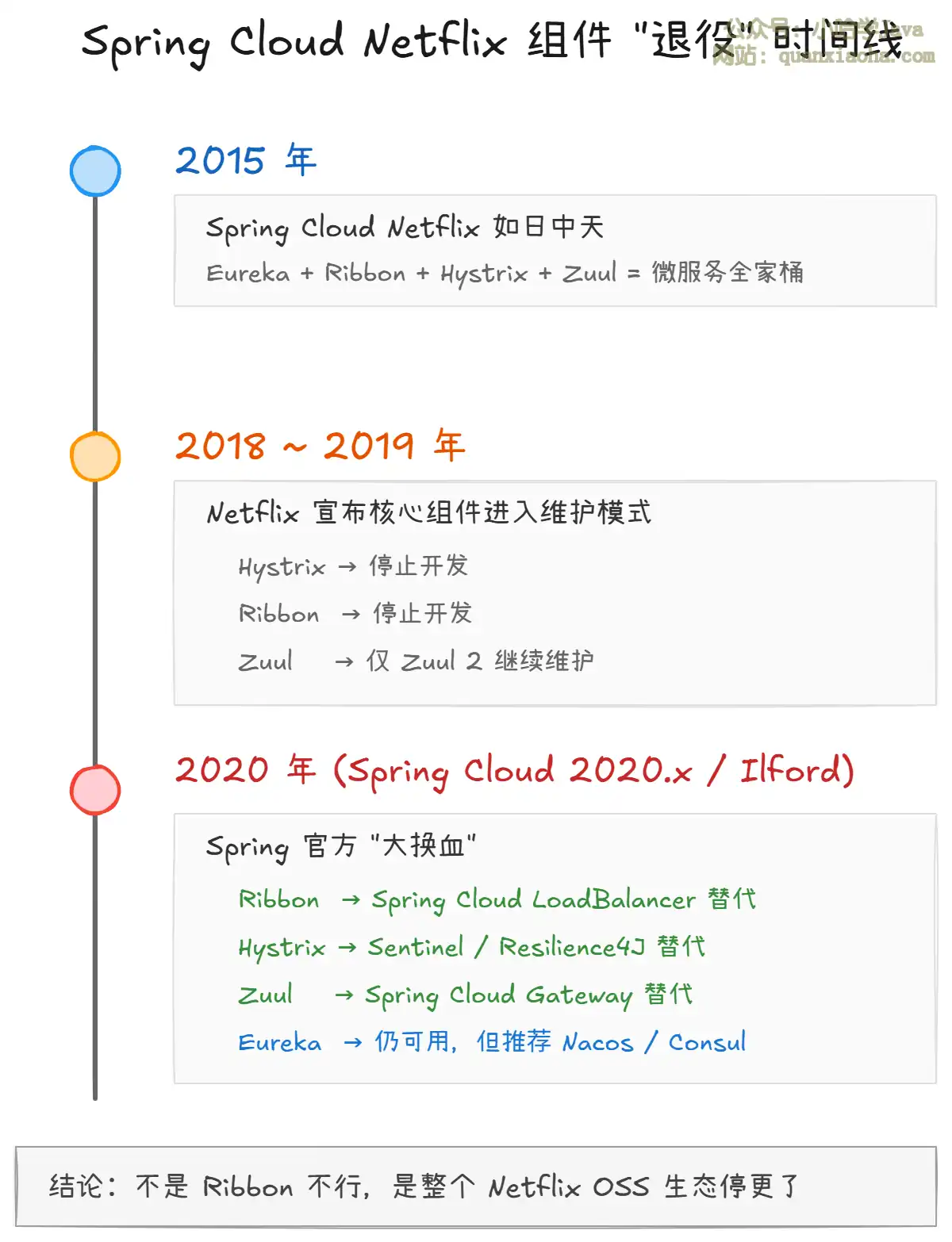 - 2020 年,Spring 官方在 Spring Cloud 2020.x(代号 Ilford)中正式移除了 Netflix 依赖,推出了自研替代方案。
