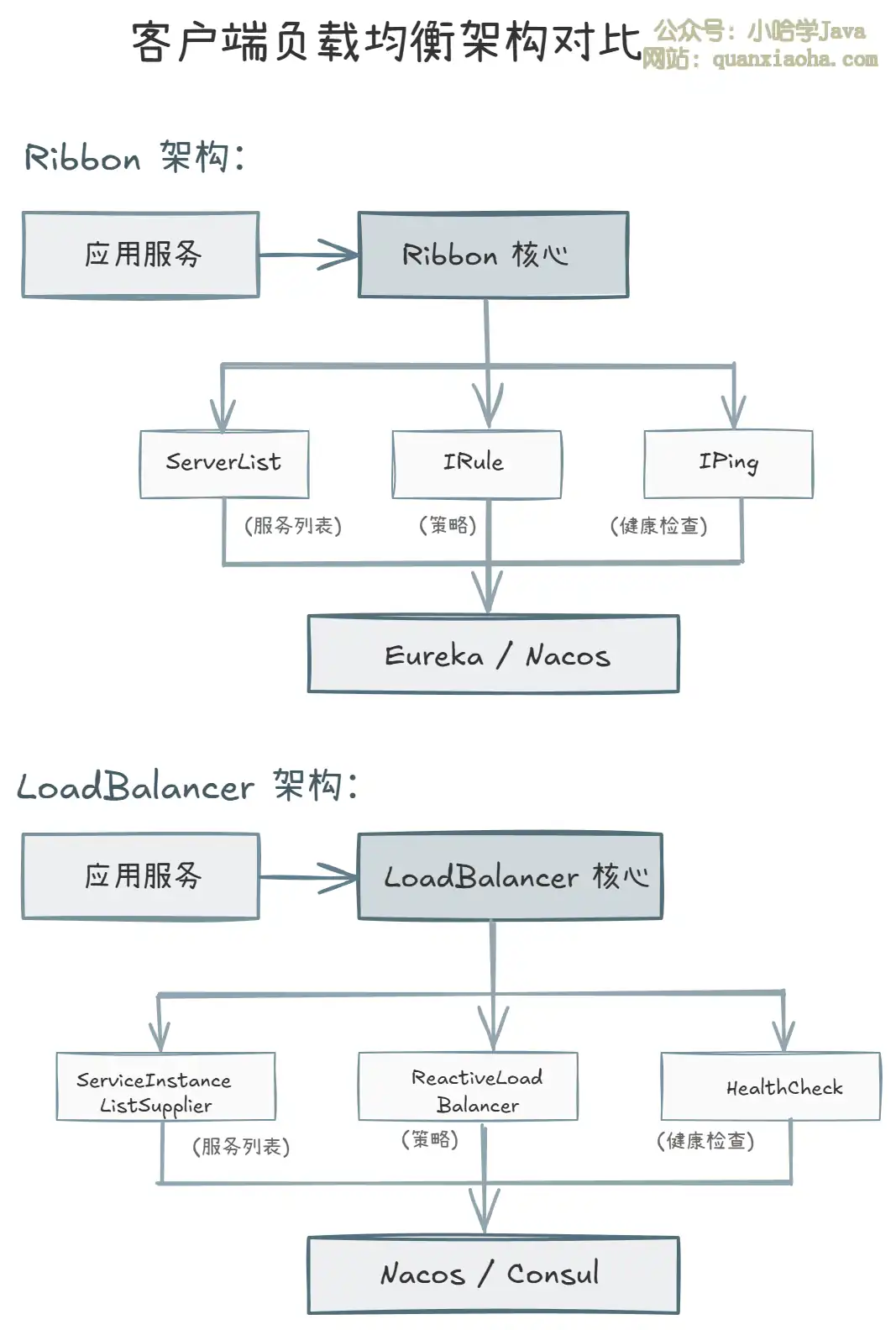 ServerList、IRule、IPing),与 Netflix 生态深度绑定。 - LoadBalancer:采用 Spring 风格的接口设计(