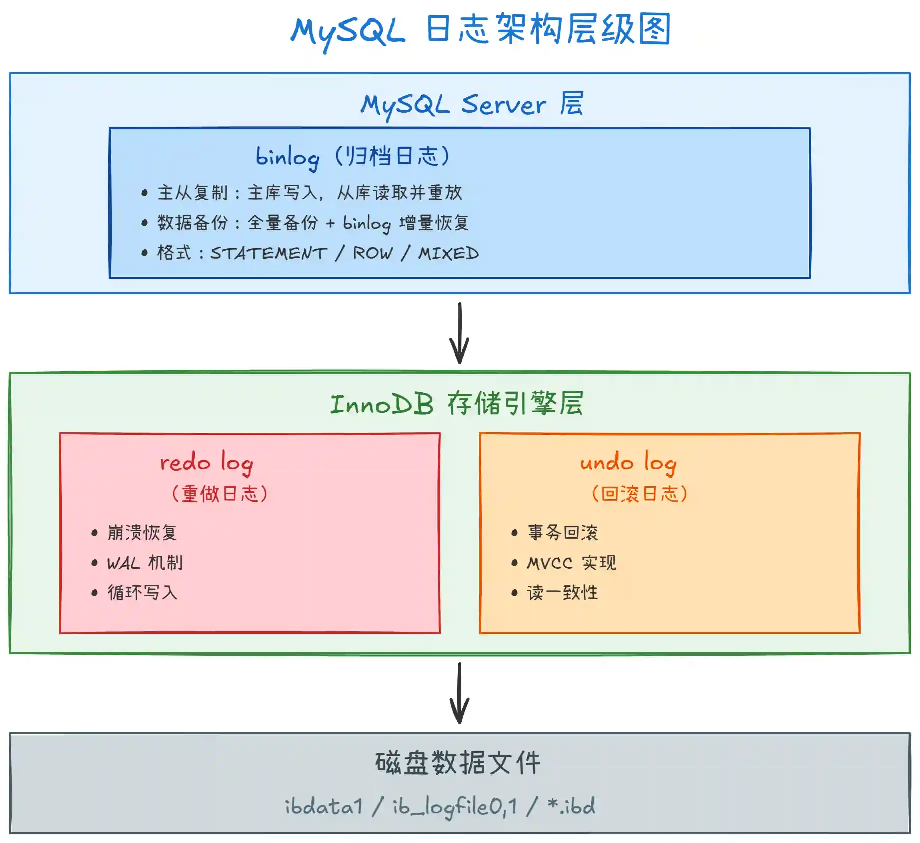 | 核心作用 | 崩溃恢复,保证持久性 | 事务回滚、MVCC,保证原子性 | 主从复制、数据备份 |