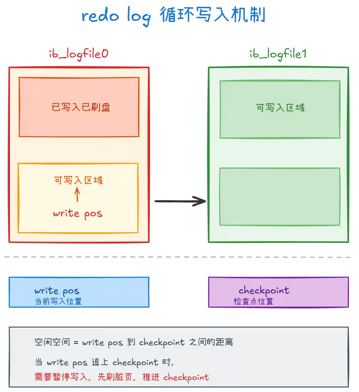 write pos记录当前写入位置,checkpoint记录检查点位置。 -