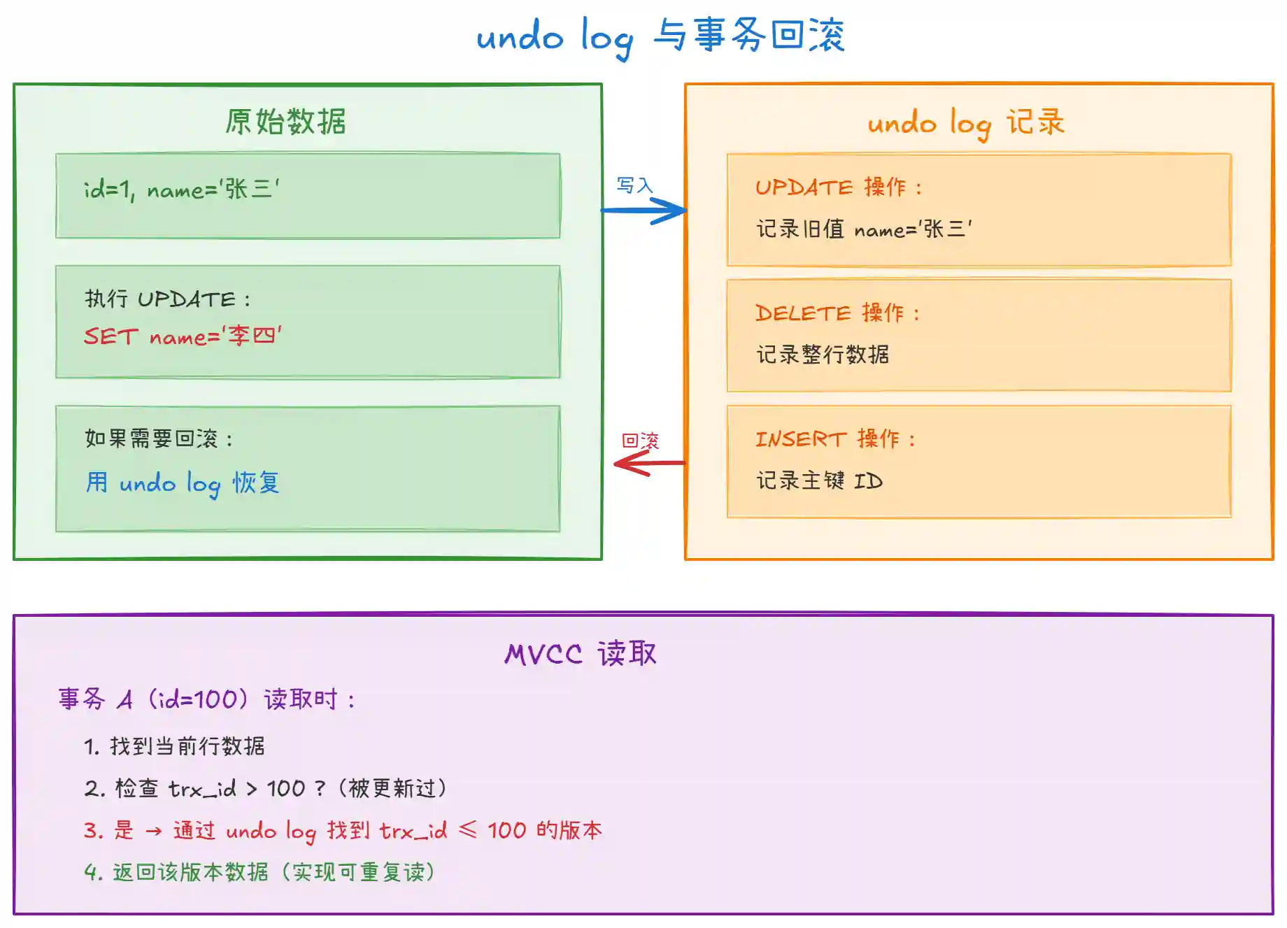 UPDATE记录旧值,DELETE记录整行,INSERT记录主键。当事务回滚时,用 undo log 中的信息恢复数据。 -