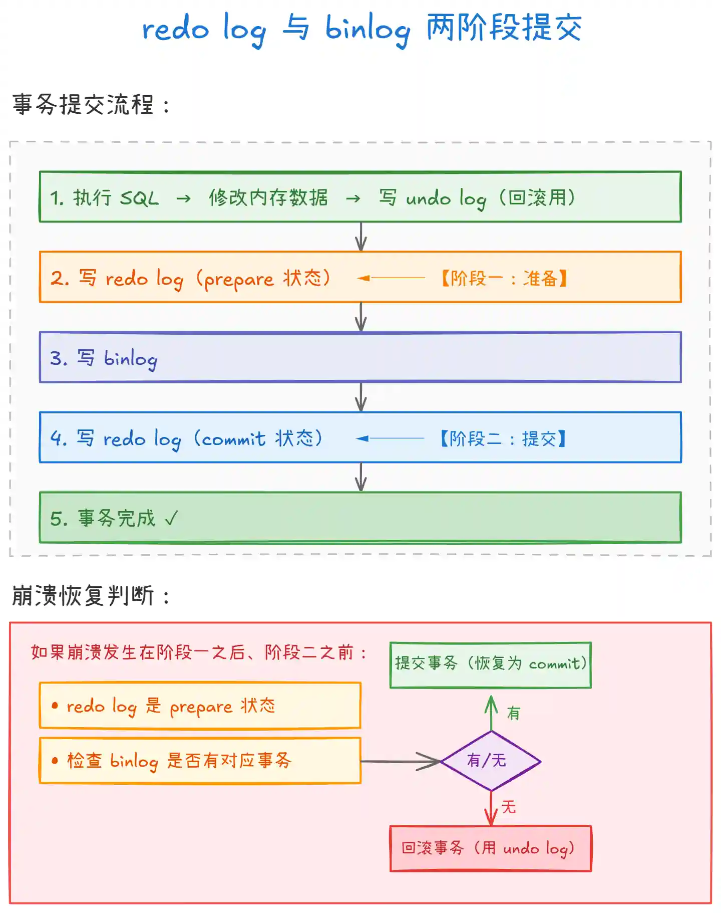 两阶段提交:先 prepare 后 commit,中间写 binlog,崩溃查状态