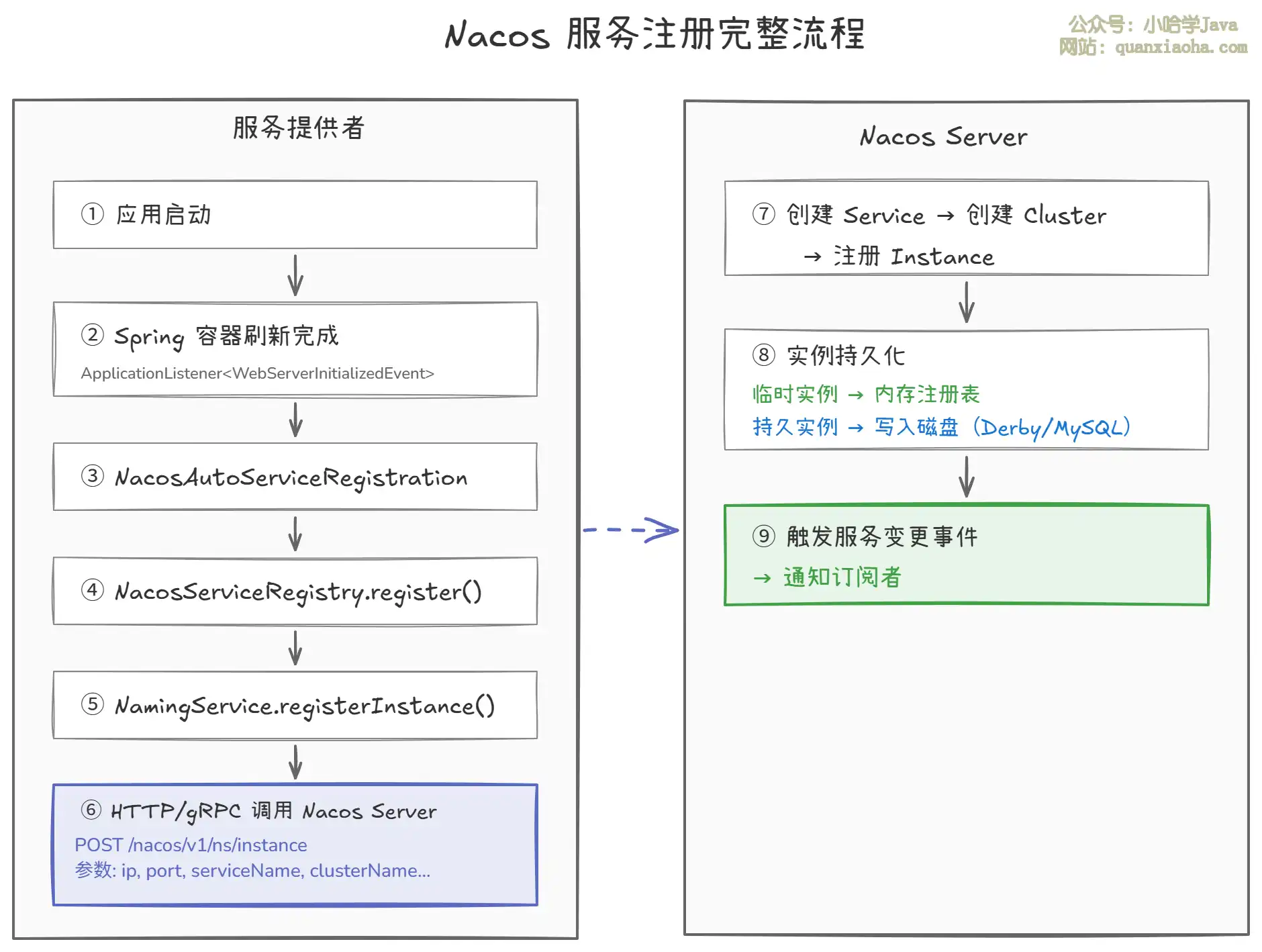 NacosServiceRegistry→NamingService的调用链,最终通过 HTTP 或 gRPC(Nacos 2.x)向 Nacos Server 发送注册请求,携带 IP、端口、服务名、集群名、权重等信息。 - 步骤 ⑦⑧⑨:Nacos Server 收到注册请求后,根据实例类型(临时/持久)决定存储方式——临时实例存内存(AP,Distro 协议),持久实例存磁盘(CP,Raft 协议)。注册成功后触发服务变更事件,通知所有订阅了该服务的消费者。