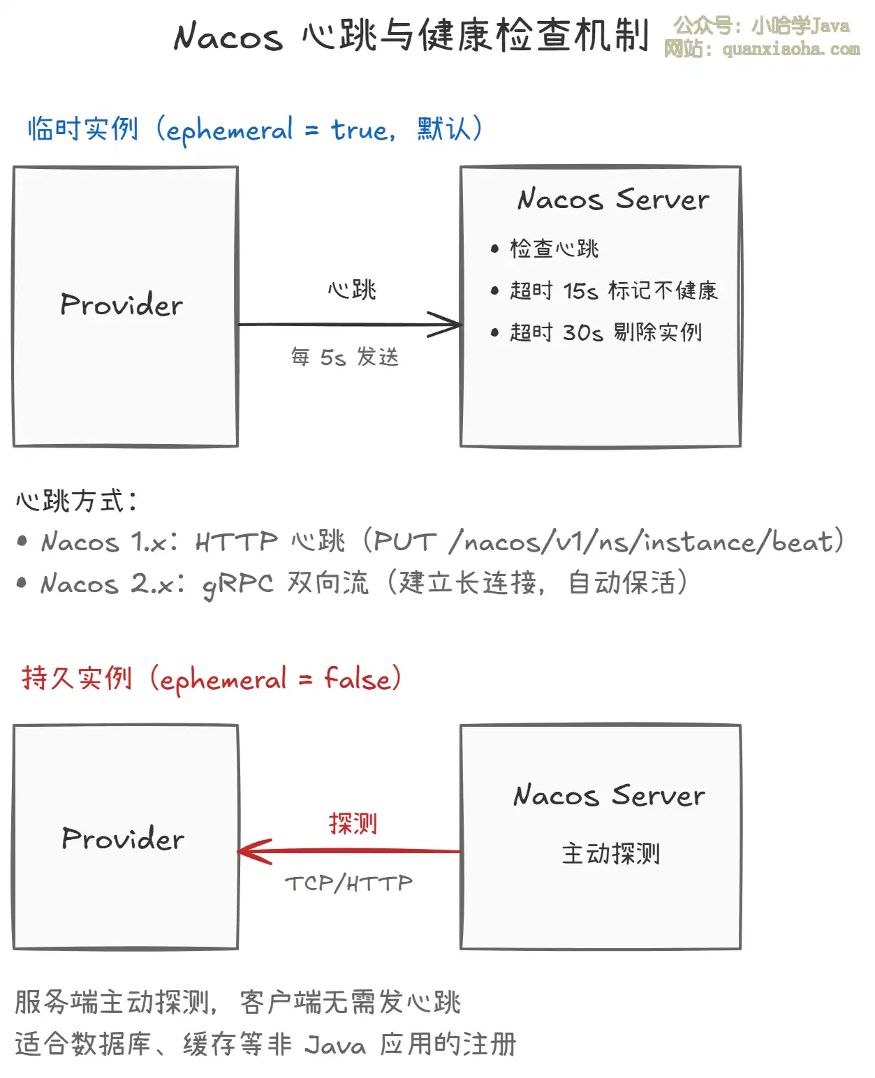 上图展示了 Nacos 两种实例类型的心跳和健康检查机制。关键要点: