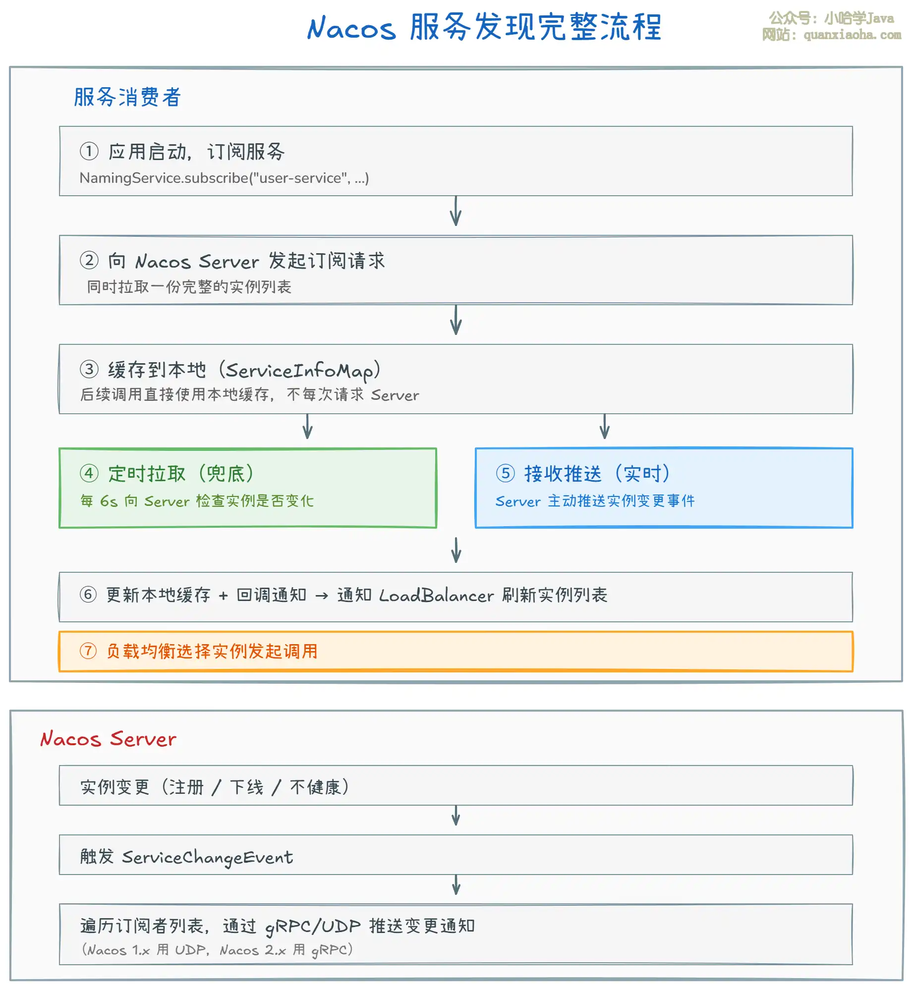 - 推送通知(实时):Nacos Server 在实例发生变更时(注册、下线、变不健康),主动向所有订阅者推送变更通知。Nacos 1.x 通过 UDP 推送,Nacos 2.x 通过 gRPC 推送,更加可靠。