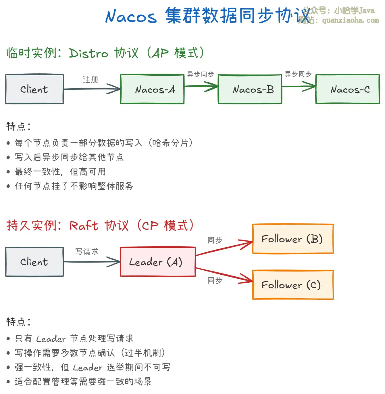 上图展示了 Nacos 集群间两种不同的数据同步协议。关键要点: