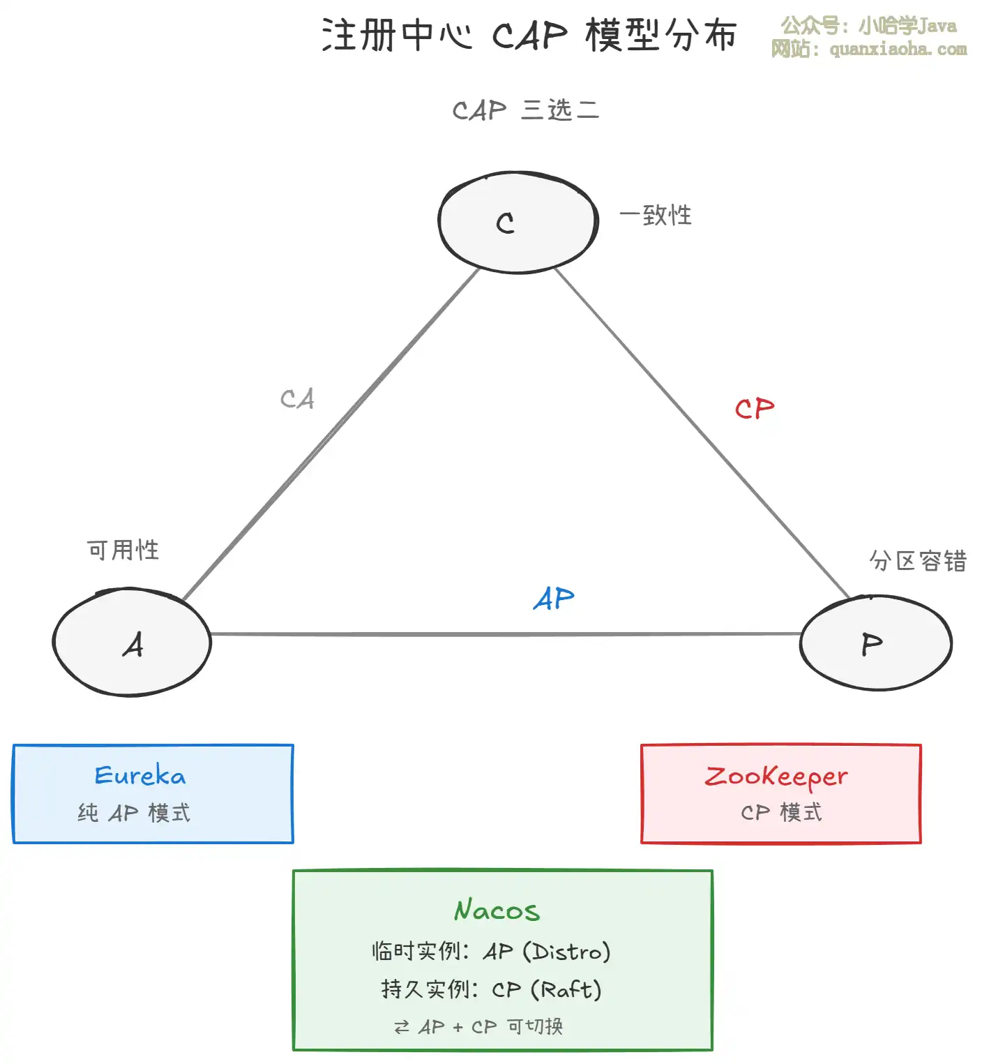 Nacos、Eureka、ZooKeeper 都可以用来做服务注册中心,但它们的设计理念、CAP 模型和功能范围有本质区别。