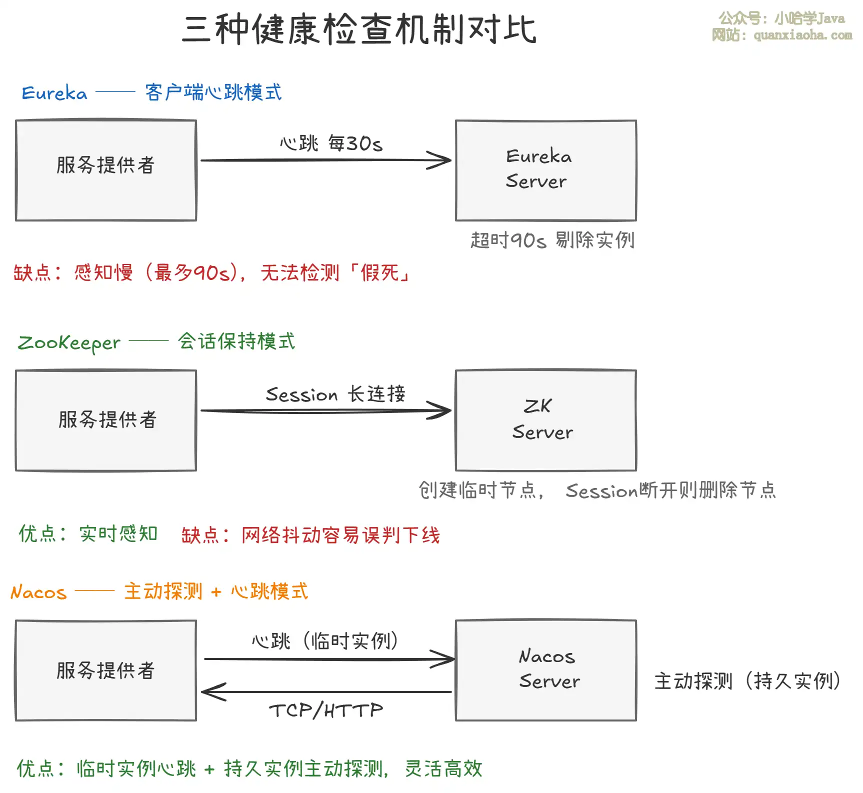Nacos:临时实例使用客户端心跳(类似 Eureka),持久实例使用服务端主动探测(TCP / HTTP / MySQL 等多种方式),兼顾了实时性和准确性。
