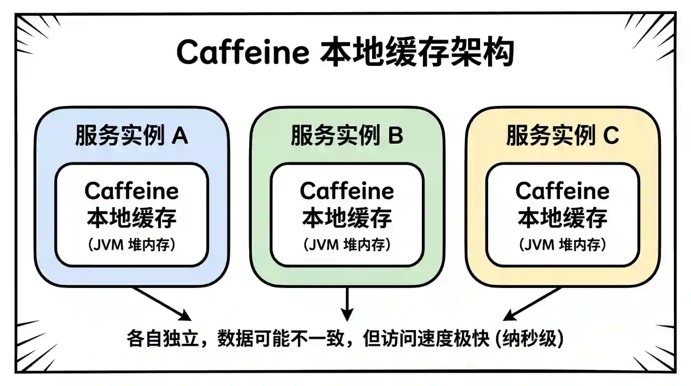 上图展示了 Caffeine 的本地缓存架构。每个服务实例都有自己独立的 Caffeine 缓存,存储在各自的 JVM 堆内存中。特点是:
